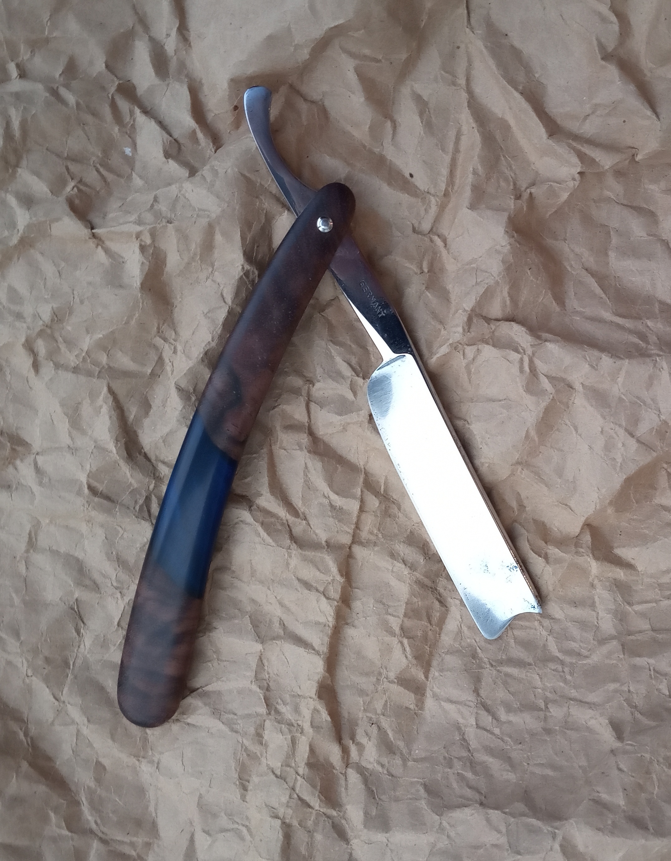 Бритва до... и после...Boker. Почистил клинок. Оправу сделал из гибрида (сбилизировнный орех и смола) Zwilling J.A. Henckels AG, Solingen (*#)Купил за 300 р. то, что было на рис. 1, то, что сделал на рис. 2-5, ржу убрал преобразователем ржавчины, потом полировал не сильно войлоком вручную с гои. Волос разрезает поперек, в ноготь не впивается (скользит), задиров никаких не чувствуется, бреет вроде ниче так. Пины да, не очень, когда алюминиевую проволоку купил, бритва уже была с медными. Для ценителей эта бритва - хлам? П.С: Эти риски на втором фото - заводские, или кто-то на наждаке шлифовал? Выглядят слишком аккуратно как-то.