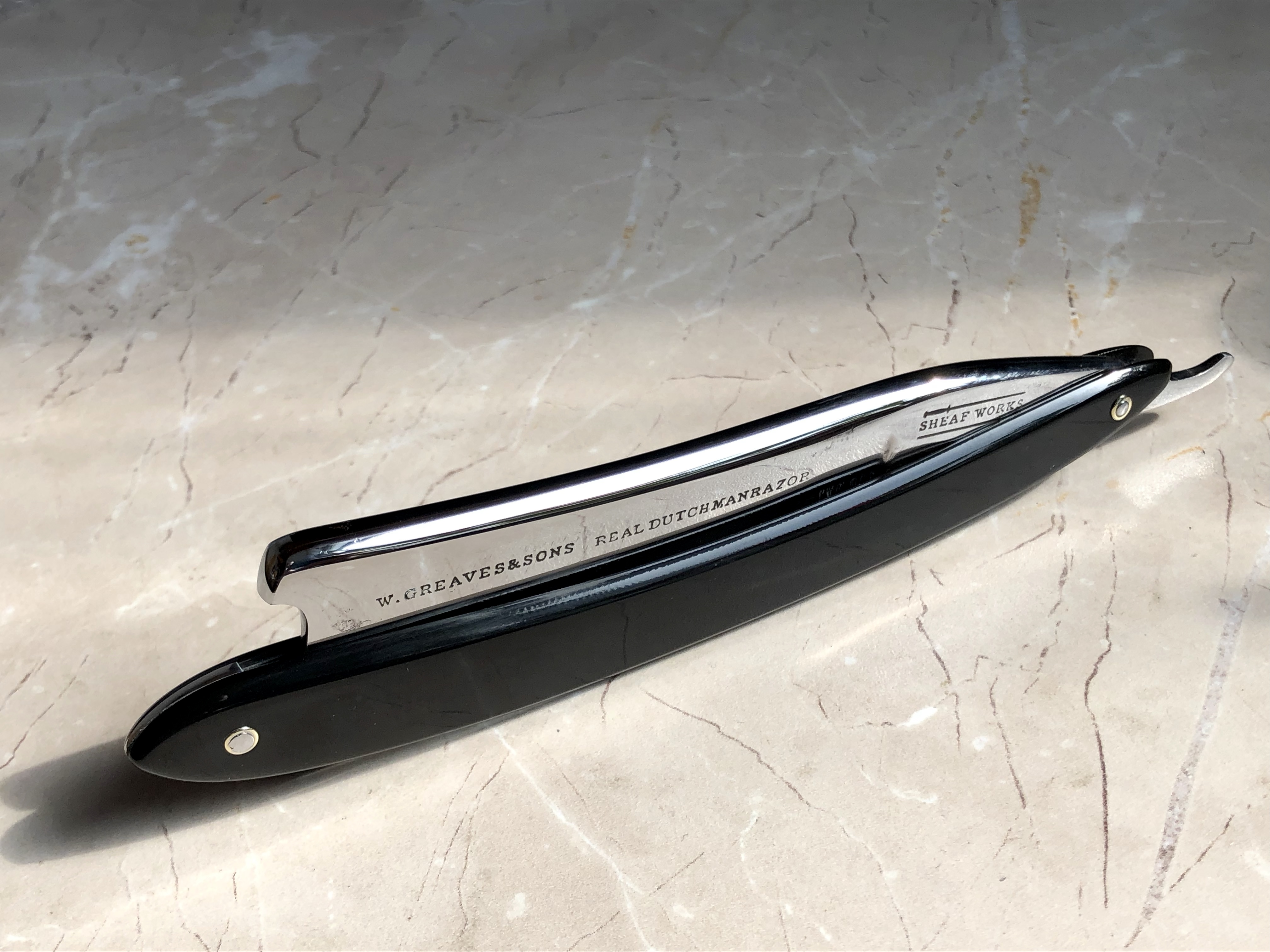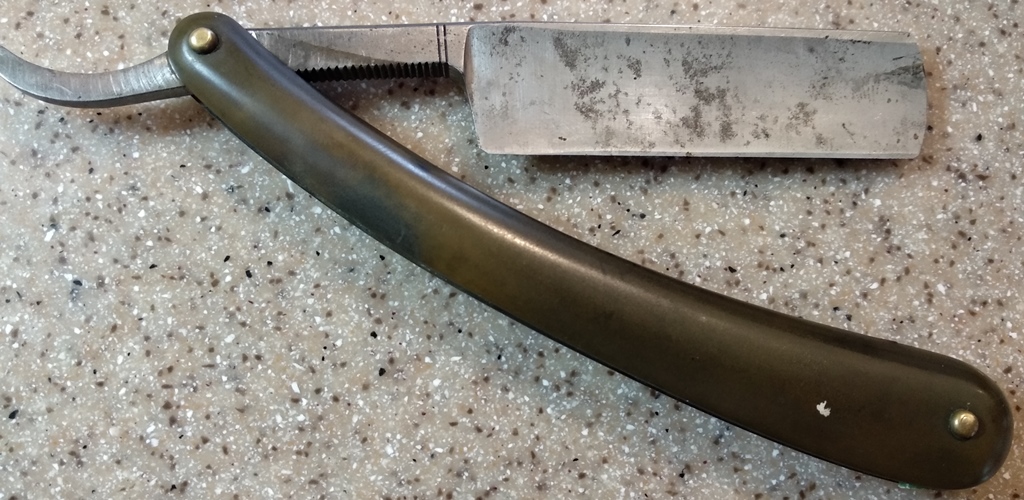 Я так думаю, что это самодельная, но выполнена очень качественно. На что обратил внимание. Помимо правильной геометрии и четких линий, можно увидеть интересный осевой пин:выточена шайба и осевой стержень разного диаметра, специально под посадочный размер шайбы. Такого никогда не видел. Сделано добротно. Ручка похожа на заводскую . Такие , из такого материала ( и окраска) могли ставить на англичан начала 20-го века.После чистки клинка удалось сохранить родный шайбы и заново их поставить, заменив только ось. Бритва ДО Всё будет ХОРОШО...тел:+79065827134