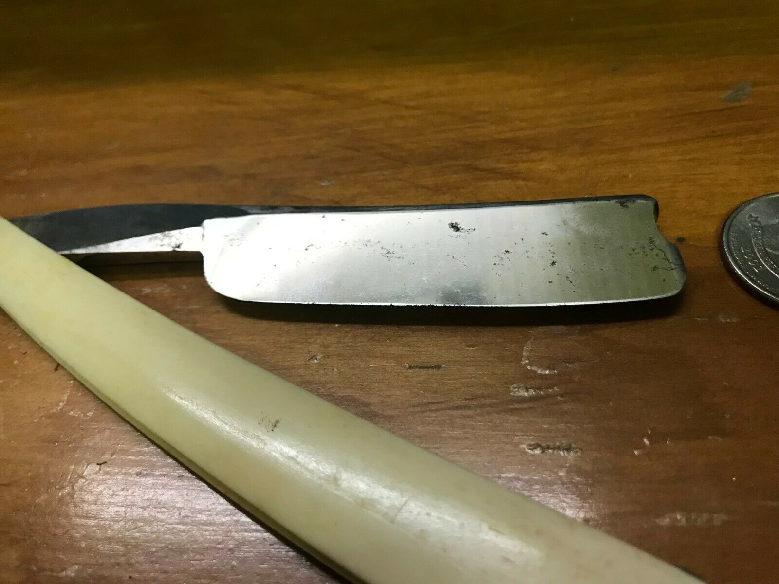 Представлю ещё одну работу, только немного поспешил фото до не сделал. Но бритва очень интересная на мой взгляд, немного почистил клинок, ручки кость верблюда, клин новый, и пины.