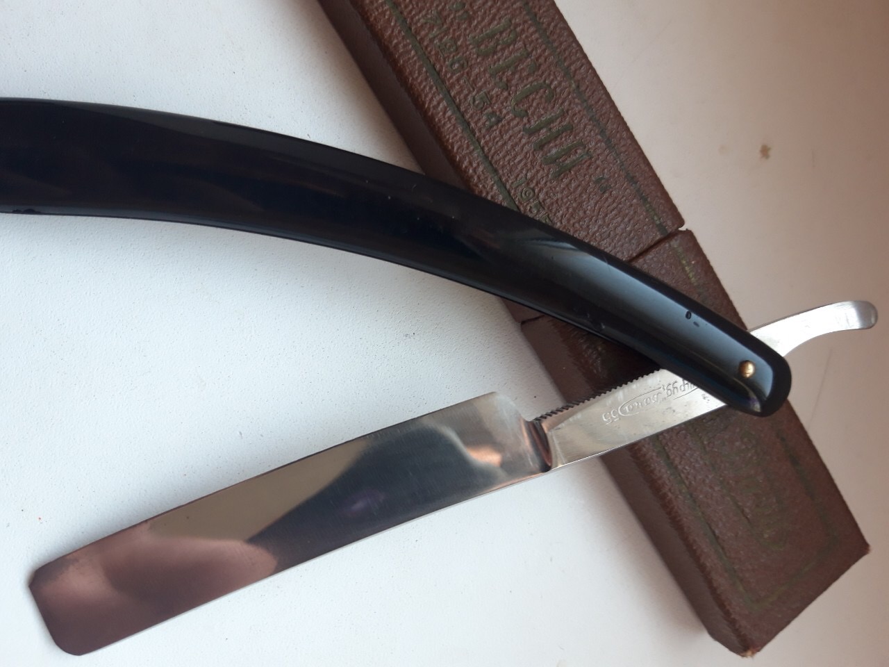 Бритва до... и после...Беру свои слова обратно, виноват. Это покрытие, встречал такое. Первое фото не посмотрел... Ремонт опасных бритв, звонить с 11-00 до 23-00, +79267729357, (whats app, telegram, VK), спросить Олега.