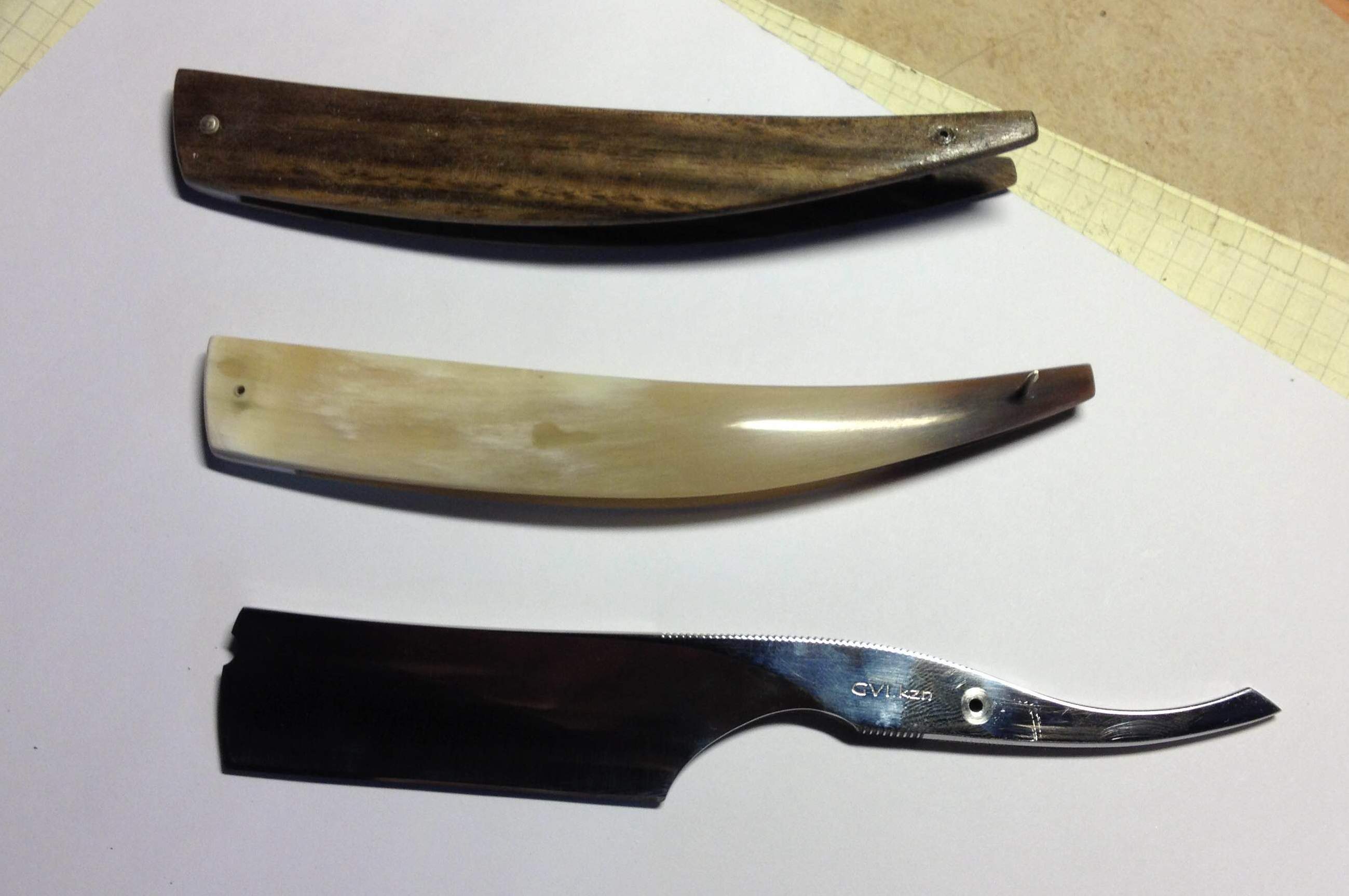 По просьбе покупателя переделал бритву Волна, вернее заменил ручку. Лежал у меня в подвале в дальнем ящике коровий рог. Не вспомню даже, как он ко мне попал. Но явно что-то из него хотели сделать высокохудожественное, с заклепками медными и пр... Spoiler Show Одним ударом дерева не срубишь. . Татарская поговорка