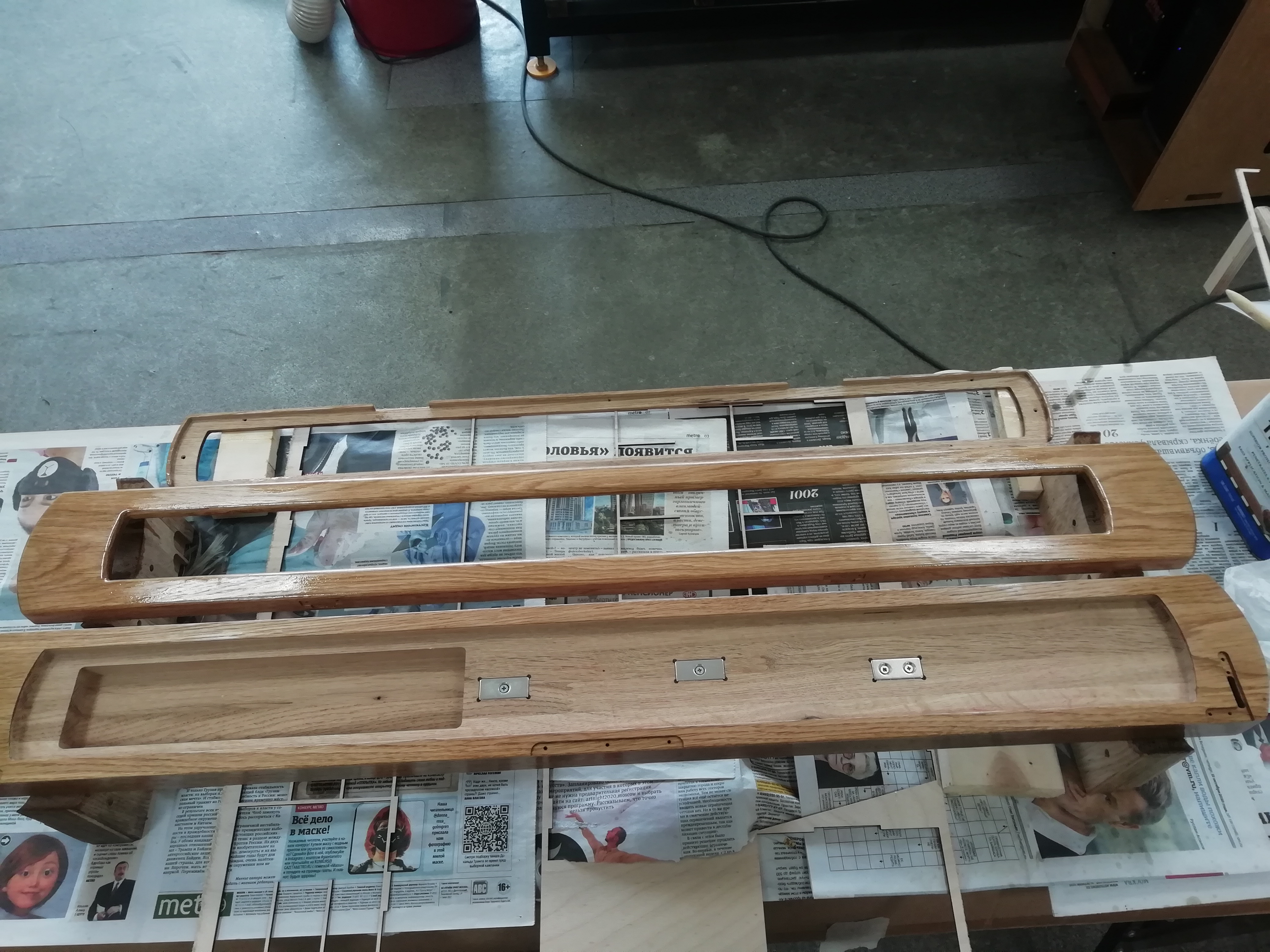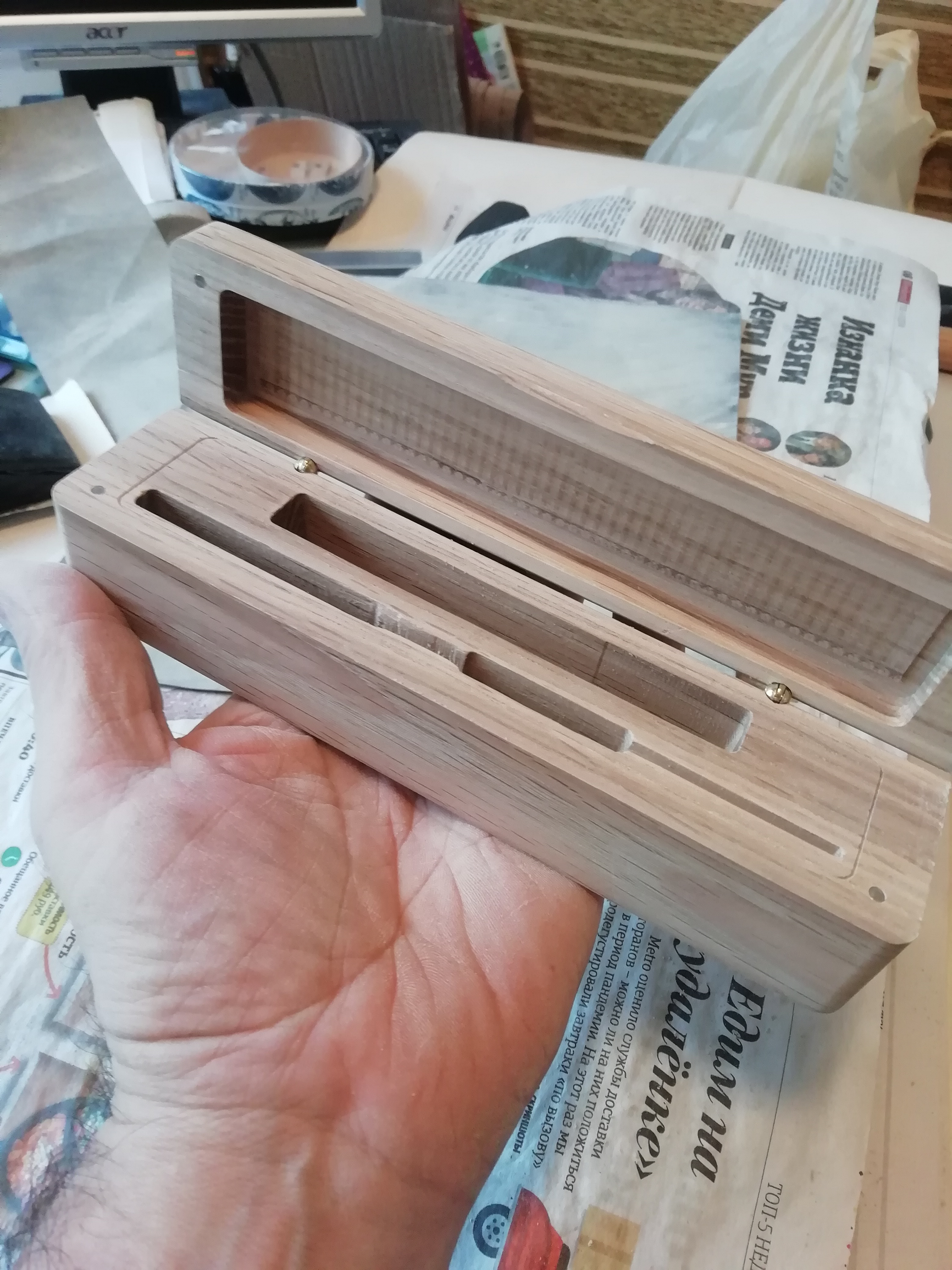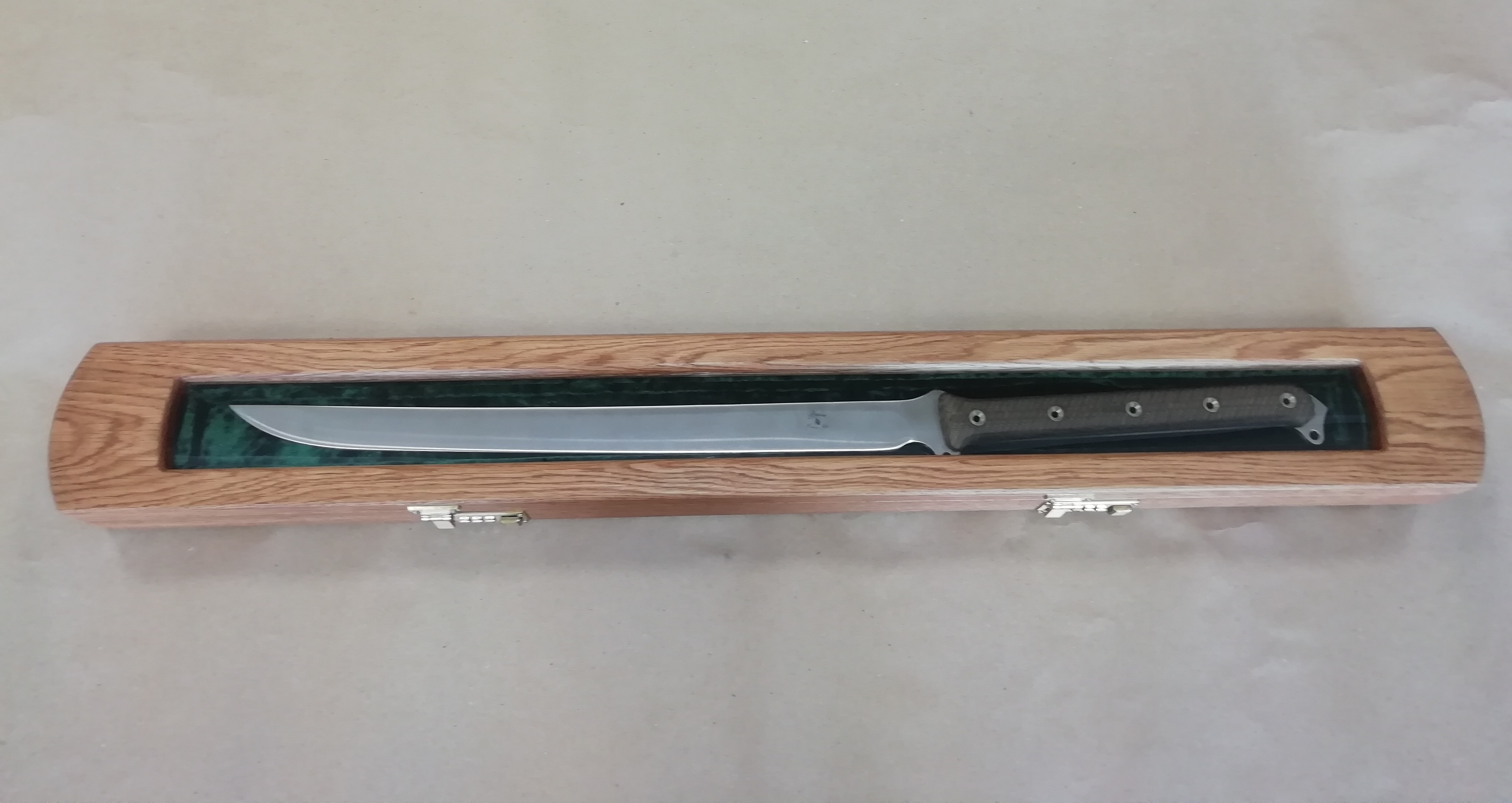 Ну вот футлярчик для не совсем бритвы, но тоже острая вещь - для Busse Combat American Kensei 47 (AK-47) Wakizashi, 2005. Явное ХО. Азотировано-ванадиевая сталь INFI (клинок сгибается вбок до 35 град без повреждений, при 58...60HRC!), длина шашечки\сабельки\ножичка - 29" (74см, ну прям длинная для меня). В общем это один из шедевров УСАшных ножеделов от уважаемого производителя. И потому, как я понимаю, это чистый вечный полочник. Потому и футлярчик делал очень внимательно, старался, чтоб он коррелировал с помещаемым внутрь предметом. Материал - дуб склейка с покрывными ламелями - 40мм толщины. 920 х 110 х 69 мм - габариты футляра. ТикОйл, Воск затемнённый Либерон, китайская и итальянская латунная фурнитура, зелёный бархат, поролон ППЭ, ППУ, стекло - акрил (Плексиглас), неодимовые магниты, фетр. Общий вес футлярки около 5...6кг, если с ножиком, в общем тяжёлый, как камрад захотел. Сабелька держится внутри футляра на 3х прямоугольных магнитиках, при их общем усилии около 10кг. (или более), что позволяет, в том числе, переносить футляр с зафиксированной ими шашкой-вакидзашкой внутри (и даже трясти футляр). Футляр стоит на 5 ножках 7х16х50 R6 мм, которые врезал на 3 мм в выборки корпуса, снизу ножек - фетр. Выношу на ваш суд, соответствует ли исполнение задаче (любое мнение интересно)?