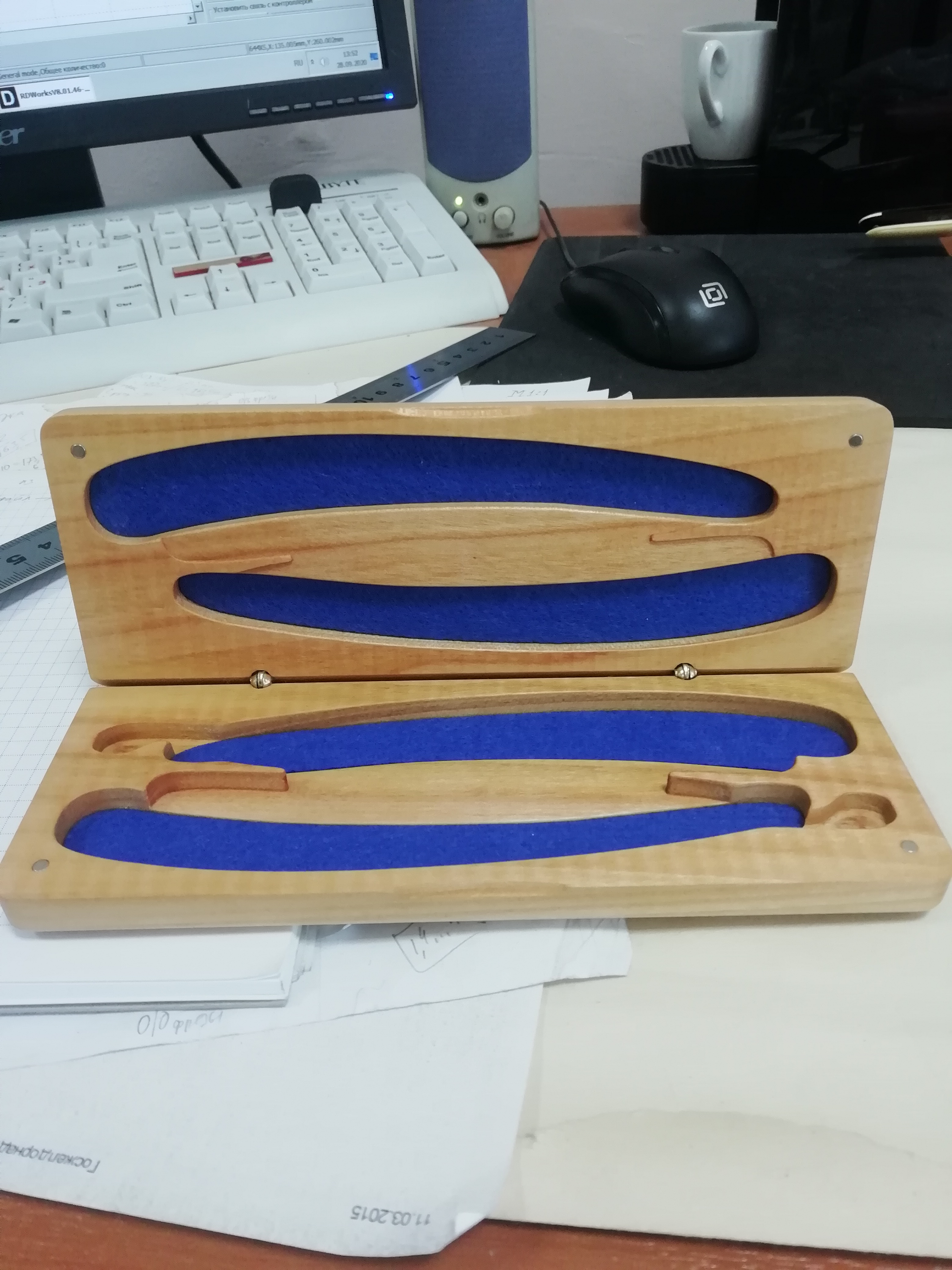 Дуб, фетр, петли, магниты, масло, воск. Дуб - фрезер ЧПУ. Фетр - лазер ЧПУ. Шкурки до F1000. Как всегда - допуски тут 10...50мкм по дереву и 1 десятка по фетру. От заложенных по проекту. Аксессуары сидят "как влитые" при закрытой крышке футляра и не стукают внутри, если трясти. (есть даже видеоотзыв камрада, заказавшего и получившего этот футляр, но не знаю, там, наверное, больше личное, в общем - ему понравилось)