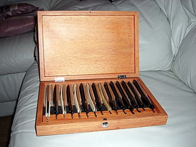 Re: Футляр для опасной бритвыСмастерил сегодня вот такую штуку, для бритв и всего что с ними связано ( и не связано тоже). Выложил пока только то, что готово к употреблению ( заточено, отполировано и т.д.) Еще места есть, много...