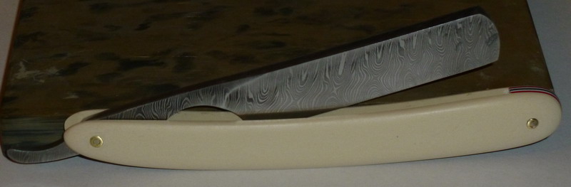 Попробовав много пришел к тому какие параметры главные в подборе ручек. И как ни странно главные это во первых здоровье, во вторых трудоемкость, потом жесткость, потом красивость ну и куча других - надо отдельную тему будет создать, обсудить. Но вот это бумажная микарта цвета слоновой кости. Обрабатывается легко, не так вредна для здоровья как карбон и стеклопластик. Глянца не дает, а имитирует именно структуру мамонта. ВО еще н решил придать глянец сверху чем нибудь и оставить так - хотя это поверхность после 1500 грит. Жесткость сравнима с G10 а по сути многократно жестче кости, так что не прогибается от нажатия, к воде инертна. Но от рук чуть чуть пачкается прям как кость. Бритва - дамаск одного из мастеров нашей необъятной раши. Бритва не моя, взялся помочь сделать ручку. Пофоткал как смог, как со вспышкой так и нет, чтобы текстру по разному подчеркнуть Проставка неизвестный пластик купленный на просторах сети с запасом разных цветов.