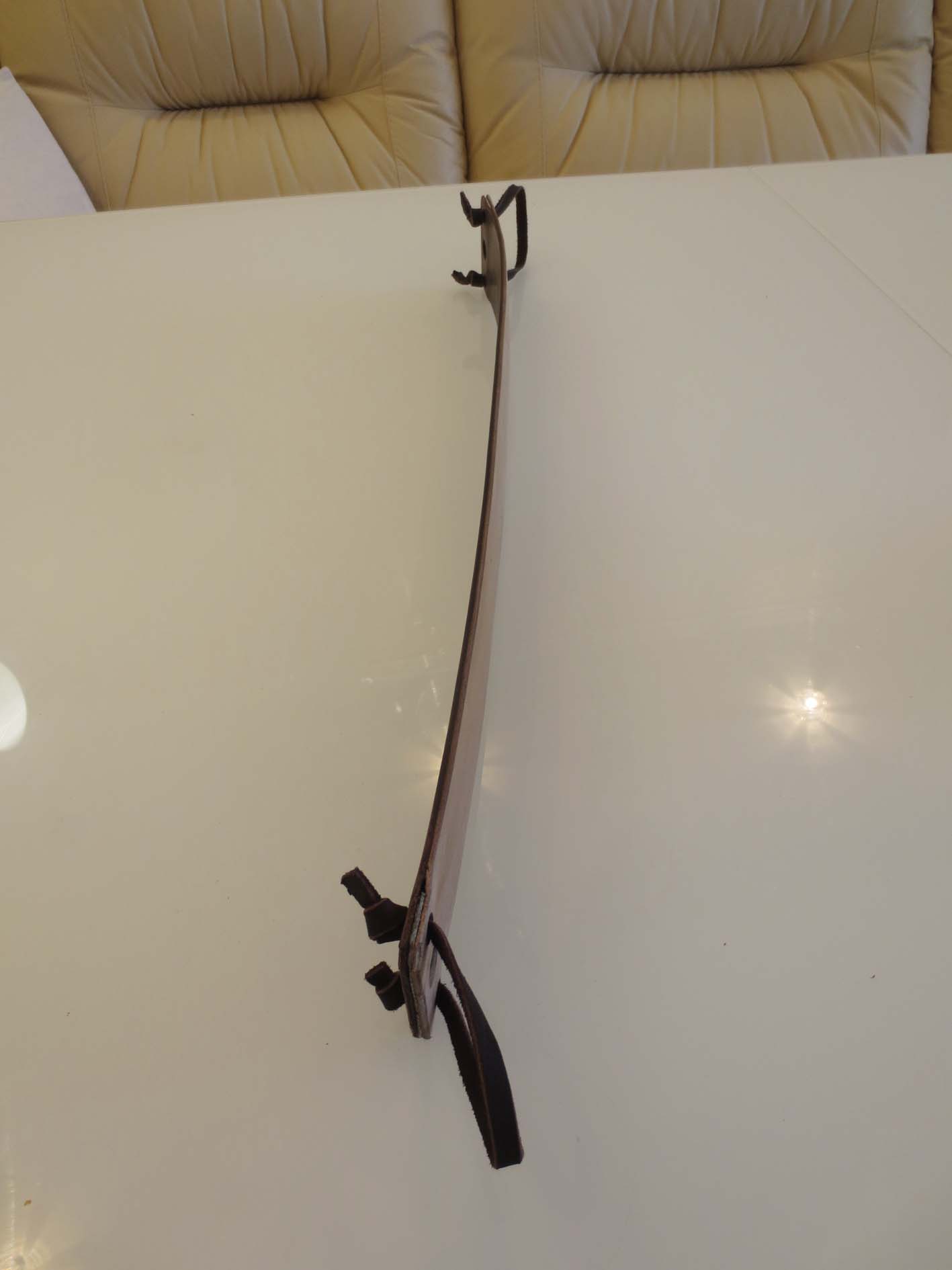 Может кому и пригодится... Задача была сделать ремень с минимальными затратами, быстро и "надёжно"..) Поэтому и лепил из того, что было, а было вот что: 1. Две полоски тонкой кожи (пола или вороток, не помню, на кожу внимание не обращаем, разговор о другом) 2. Крепёжная пластина из Леруа. Полоски кожи отшлифовал, нанес 88-й клей и дав просохнуть немного склеил между собой, оставив с торцов сантиметра по три. Зажал струбцинами через прокладки минут на десять и занялся пластиной. Отрезав от неё по краям полоски, как показано на рисунке и рассверлив одно отверстие (на пластине отверстия несимметричны), я вклеил их между полосками кожи (металл зачистить обязательно) на тот же 88-й клей. Потом вырезав тонкие ремешки из обрезков кожи, продел их в крайние отверстия моей заготовки. И смочив кончики водой, завязал с другой стороны. Получилось вот так. Потом обработал торцы воском и затирашкой.. И вуаля, ремень готов..) По времени затрачено около полутора часов вместе с "думками" и чаепитием..) От вертлюжка на ремне отказался, не держит плоскость при правке, ремень качается вдоль оси.. ТТХ ремня: Толщина рабочей поверхности - 4,2 мм. Ширина - 65мм Длина - 540 мм Вес - 148 гр..)) Мною замечено из плюсов: 1. Ремень симметричен и при такой ширине это позволяет более равномерно использовать поверхность. 2. При заваливании краёв рабочей поверхности можно скорректировать нужный профиль поверхности путём разгиба , сгиба торцевых пластинок (недаром Франц говорил про наложение скотча вдоль ремня). 3. Ремень можно цеплять, как за центральные отверстия, так и за ремешки ( при зацепе за ремешок вообще не качается) 4. Не нужно специальных приспособлений, заклёпок, хольнитенов, люверсов и т.д. 5. Минимум затрат и времени..))) Про минусы вы мне сами сейчас всё расскажете..) С уважением, ваш Р.К. Бесит, когда приходится пользоваться бритвой моложе себя...