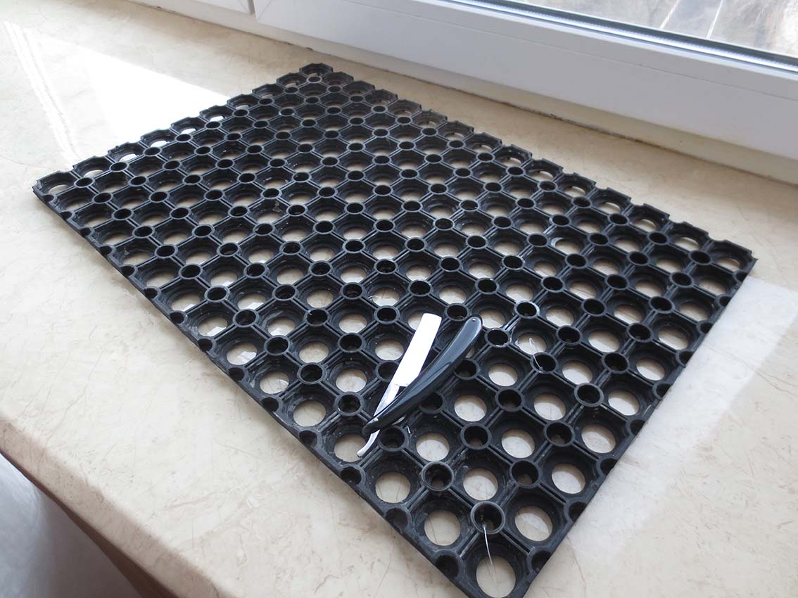 Два стекла по 4-5 мм приклеиваются к друг другу через двухстронний строительный скотч. Цена вопроса три копейки. Сам ровняю на стёклах 5 мм толщиной, использую обе стороны. Стекло укладываю на резиновый коврик из Ашана, чтоб не скользило и не царапало острыми краями поверхность столешницы. Причем коврик должен быть не сплошным, как я видел на многих видео, а типа как на фото, чтобы попавший под него с водой в процессе работы порошок карбида кремния , тоже не царапал поверхность на которой работаете. Можно края стекла наждачкой крупной пройти, ну это для перфекционистов...) Вот такой коврик... Бесит, когда приходится пользоваться бритвой моложе себя...
