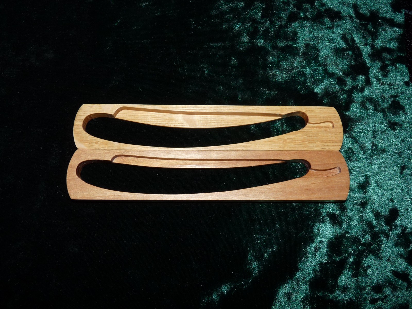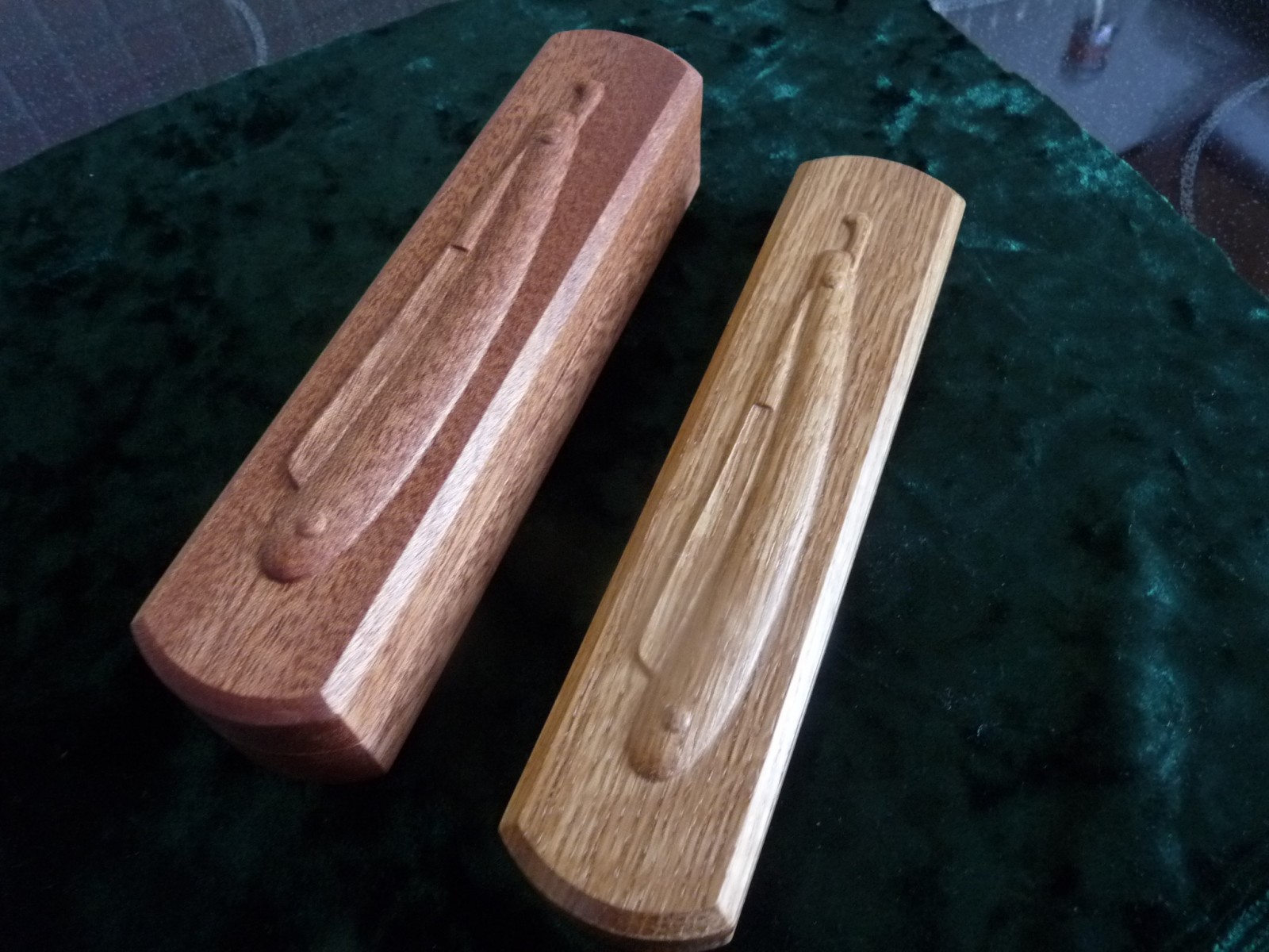 Здесь уже итоговый мой (к которому я пришёл после проб и ошибок) - "типовой" вариант футлярчика (габариты/кроме высоты/, форма, наполнение) с небольшими вариациями типа рельефов и надписей. Для бритв малых и средних размеров, до 6/8 где-то (со вкладышами или без). Но, если делать без вкладыша, может зайти практически любая бритва для бритья - внутренний габарит 30х166мм. Всякие Монстры и Кастомы нуждаются в индивидуальном подходе. Именно этот вариант из красного дерева получился самым сбалансированным с моей точки зрения, как по расцветке дерева, компоновке/сочетании линий дерева на крышке и корпусе, так и по точности исполнения, центровкам... в общем некий мой пик. Рельеф бритвы делал фрезой d2мм, а рельеф букв на дне (они выпуклые и "утоплены" в овальной выемке на 2мм от поверхности дна) - гравером d0.5мм. По сравнению с "дубовой" версией футляра весь рельеф бритвы ещё приподнял над уровнем "пола" на 0,5мм, так как футляр получился повыше (на пине максимум - 3,15мм), и так смотрится лучше, IMHO. Для сравнения даю фотки с аналогом из дуба ( сделанного для другого человека). И фотки, где короба показываю с заменой крышек этих двух футляров друг у друга - абсолютная взаимозаменяемость. Как всегда, вставляемые сменные вкладыши (подкладку тоже можно менять) под разные бритвы.