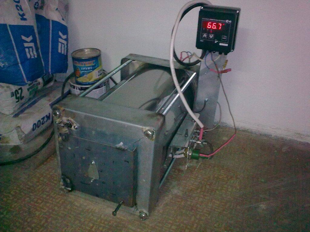 Термопару подогнал друг кузнец, контроллер купил за нестрашные деньги. Чтоб снизить мощность нагрева и для управления включением и выключением нагревателя использовал старый промышленный тирристор. Но он быстро отказался включать цепь, и пришлось поставить магнитный пускатель. Тирристор оставил в роли диода для снижения мошности нагревателя печи.