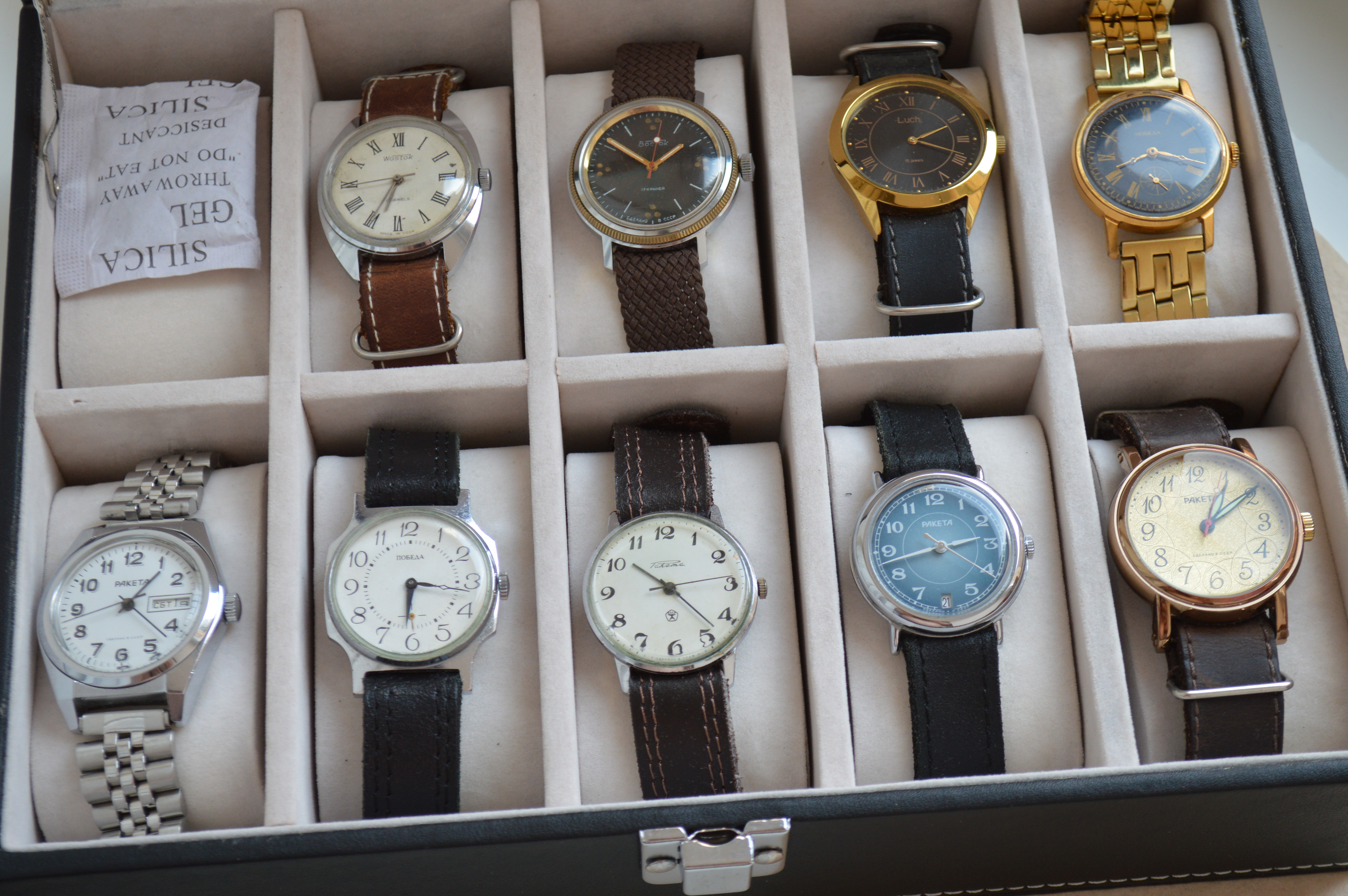 Наши часыim-g, я Восток (крайние левые в верхнем ряду) всегда надеваю на 9 мая. часы, которые дед подарил моей маме, но потом носил сам долгое время. дед партизанил, по-этому для меня это важный момент.  хотя, они и сейчас на мне  Наши часыЭх... В этой шкатулке - часть моих часов "Восток". Есть еще шкатулки с часами "Полет", "Слава", "ЗиМ", "Ракета", "Луч". Отдельно - "Победа" разных часовых заводов (питаю слабость к этому бренду). P.S. Качество фото, конечно, так себе получилось.