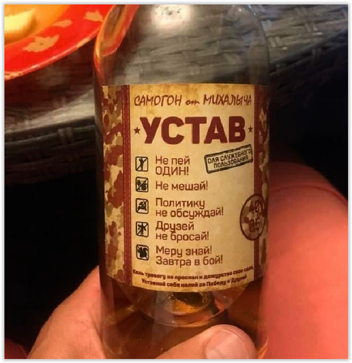 Внизу этикетки написано: „Коль тревогу не проспал и дежурство свое сдал Уставной себе налей за Победу и Друзей”. Хороший тост! Кто служил, тот поймет.