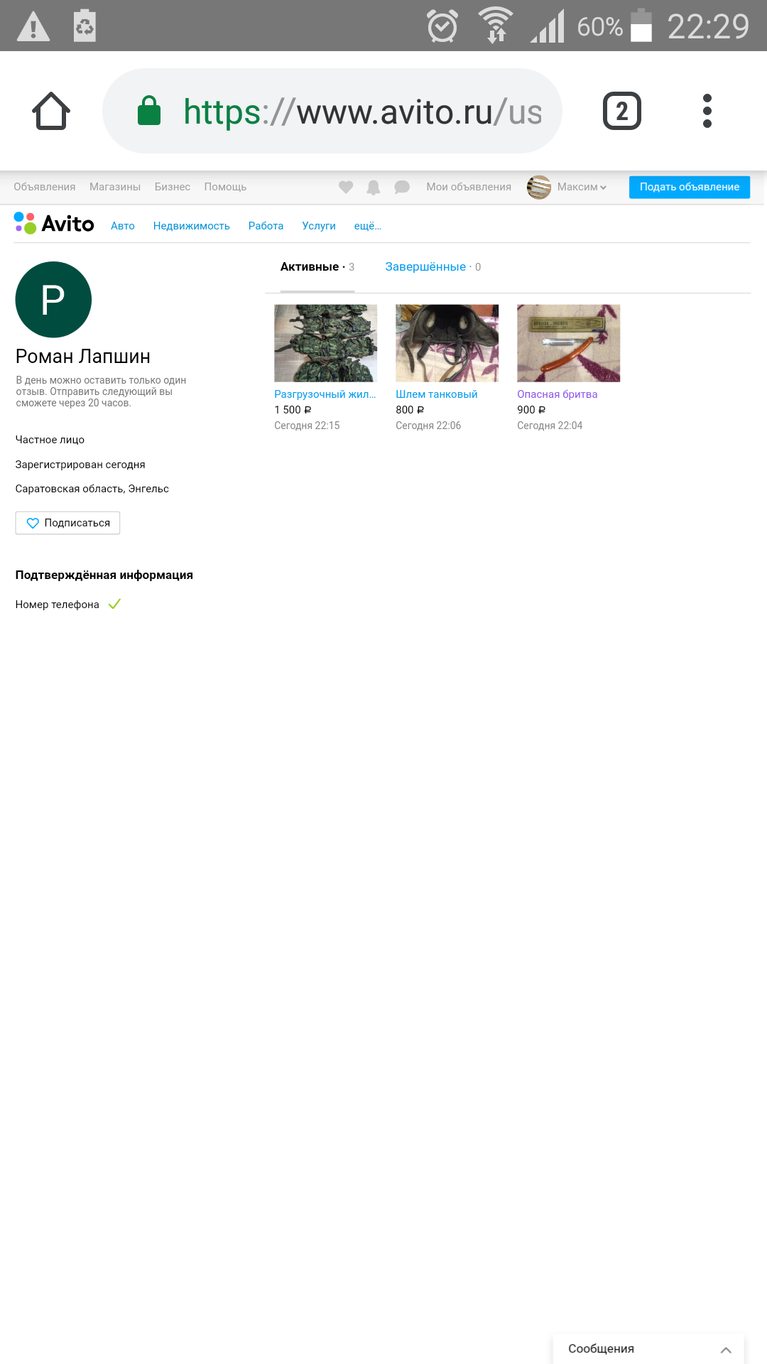 Он после блокировки создал новый профиль (скриншот 2) и опять выставил краденые вещи, прилагаю скриншоты его нового профиля, под ником «Роман Лапшин», я опять отправил на авито претензию, его опять заблокировали.