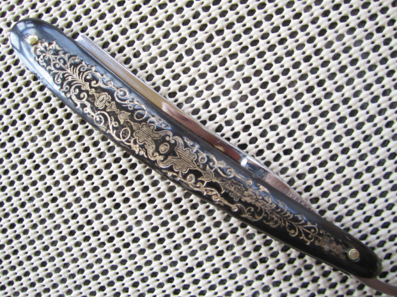Что же касается цены... Популярность в мире на WADE & BUTCHER за последнее десятилетие сильно возросла и сейчас даже не реставрированные не убитые бритвы трудно найти дешевле 200 баксов, а реставрированные уходят за 300-500 и выше в зависимости от самой бритвы. Тут же мы имеем просто отличную бритву с очень удобным для собственного пользования (а не для брадобреев) размером, что для этой фирмы и возраста достаточно редки (обычно не менее 7/8), да и качество реставрации крайне высоко. Конечно пины тут не родные! Её же реставрировали, значит и пины меняли. Если бы это было бы не так - в районе пина на клинке были бы заметны небольшие потемнения (не разбирая бритву сложно там всё досконально почистить). А ручка родная, из рога - это хорошо видно на последней фотке и на 4й (там скол идёт на ручке, бакелит так не скалывается, только рог). Re: WADE & BUTCHERm-s-r, ручка - прессованный рог.
