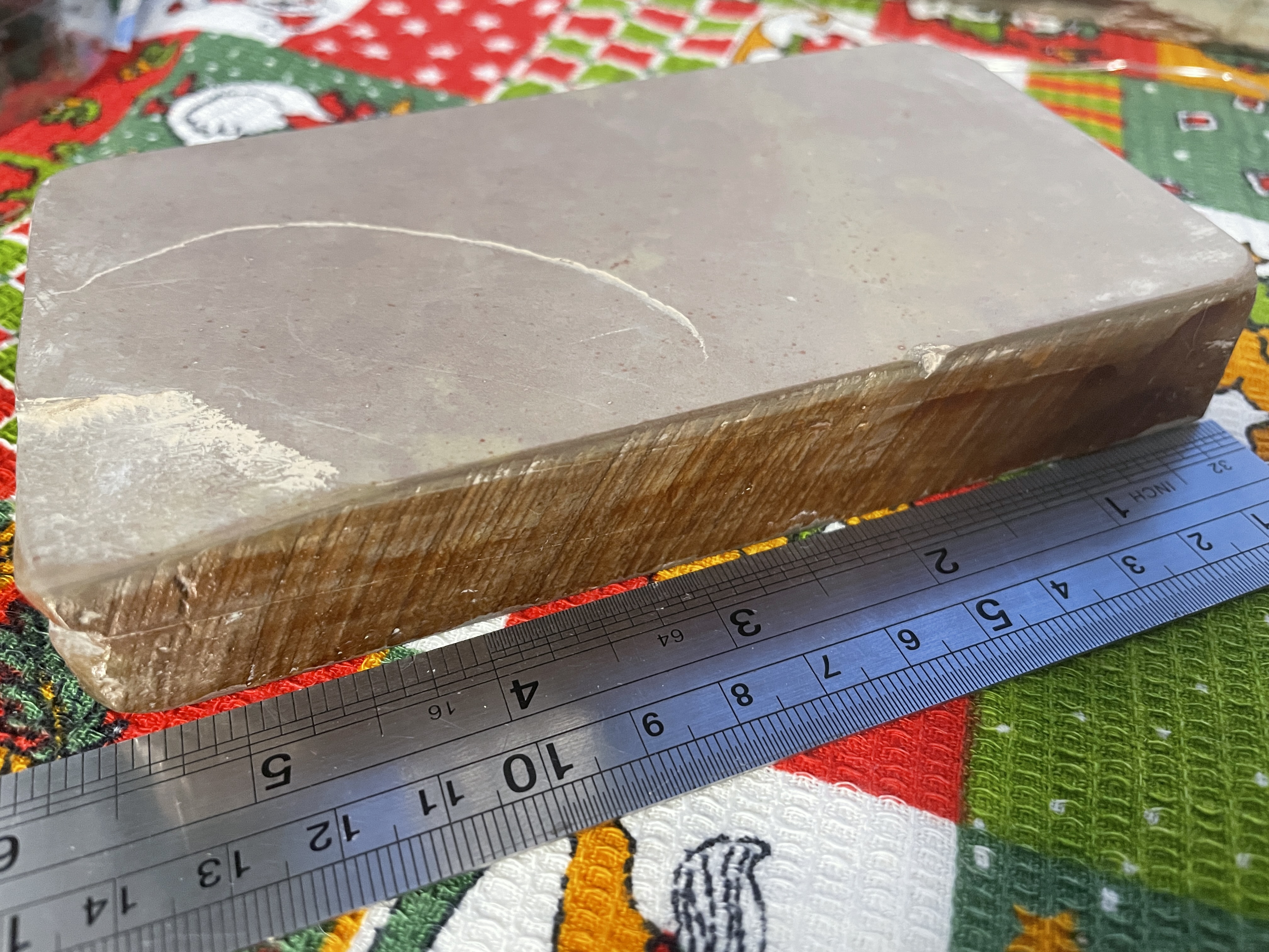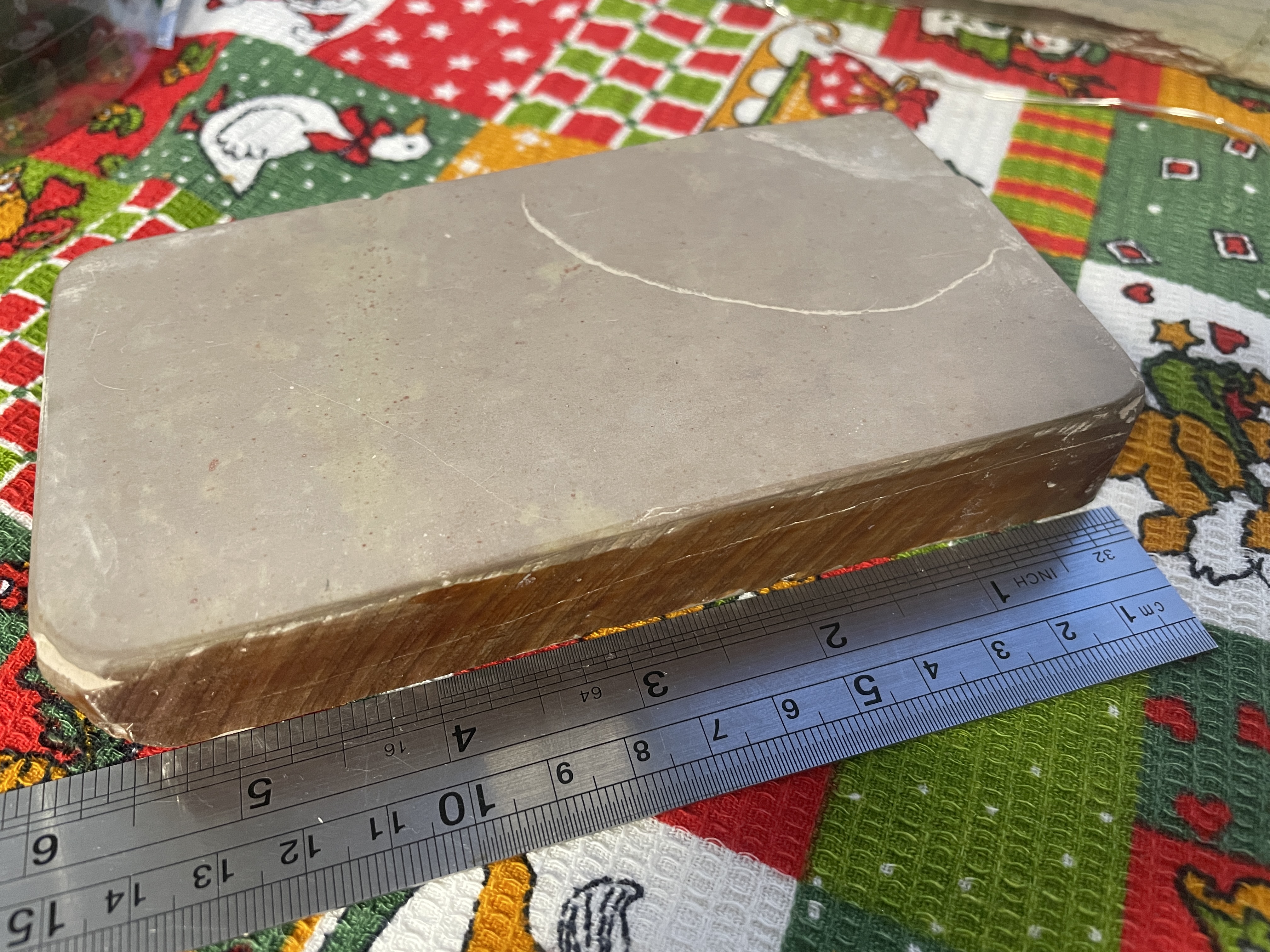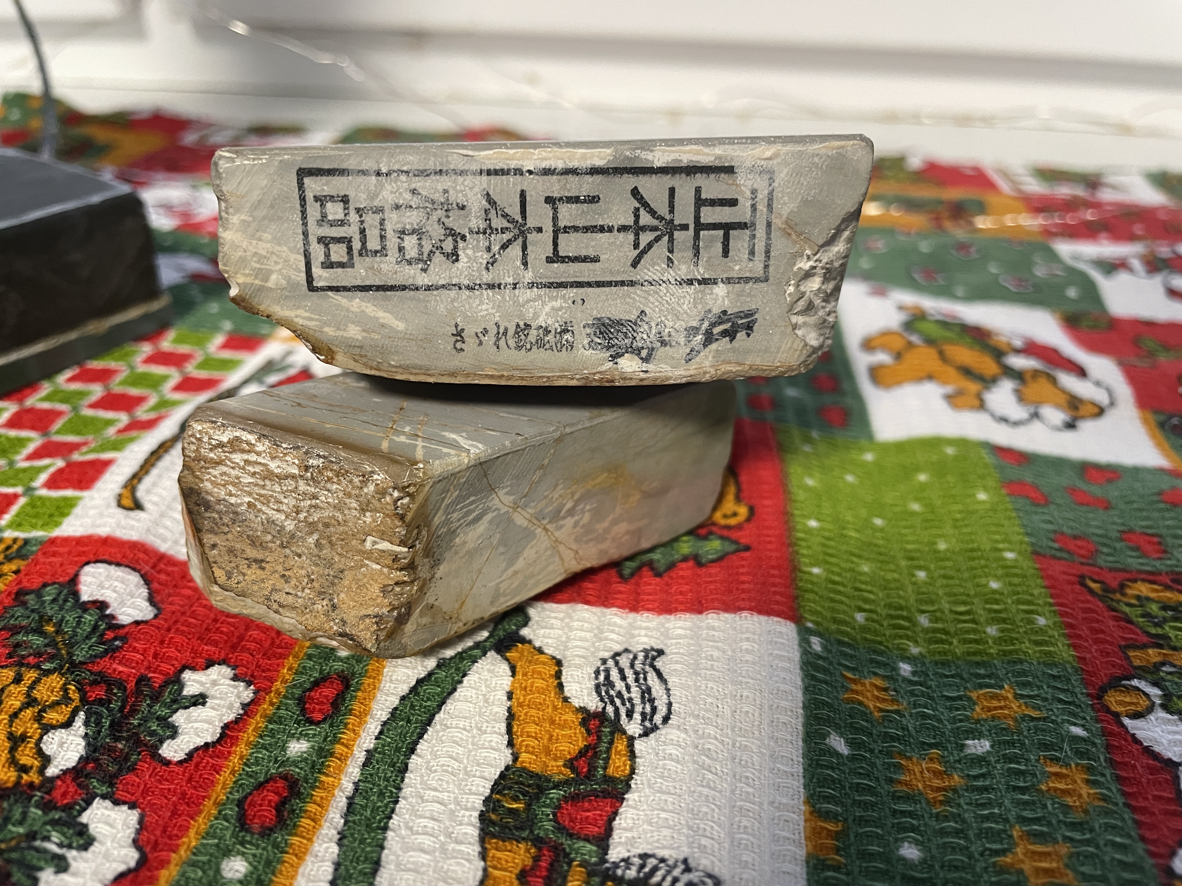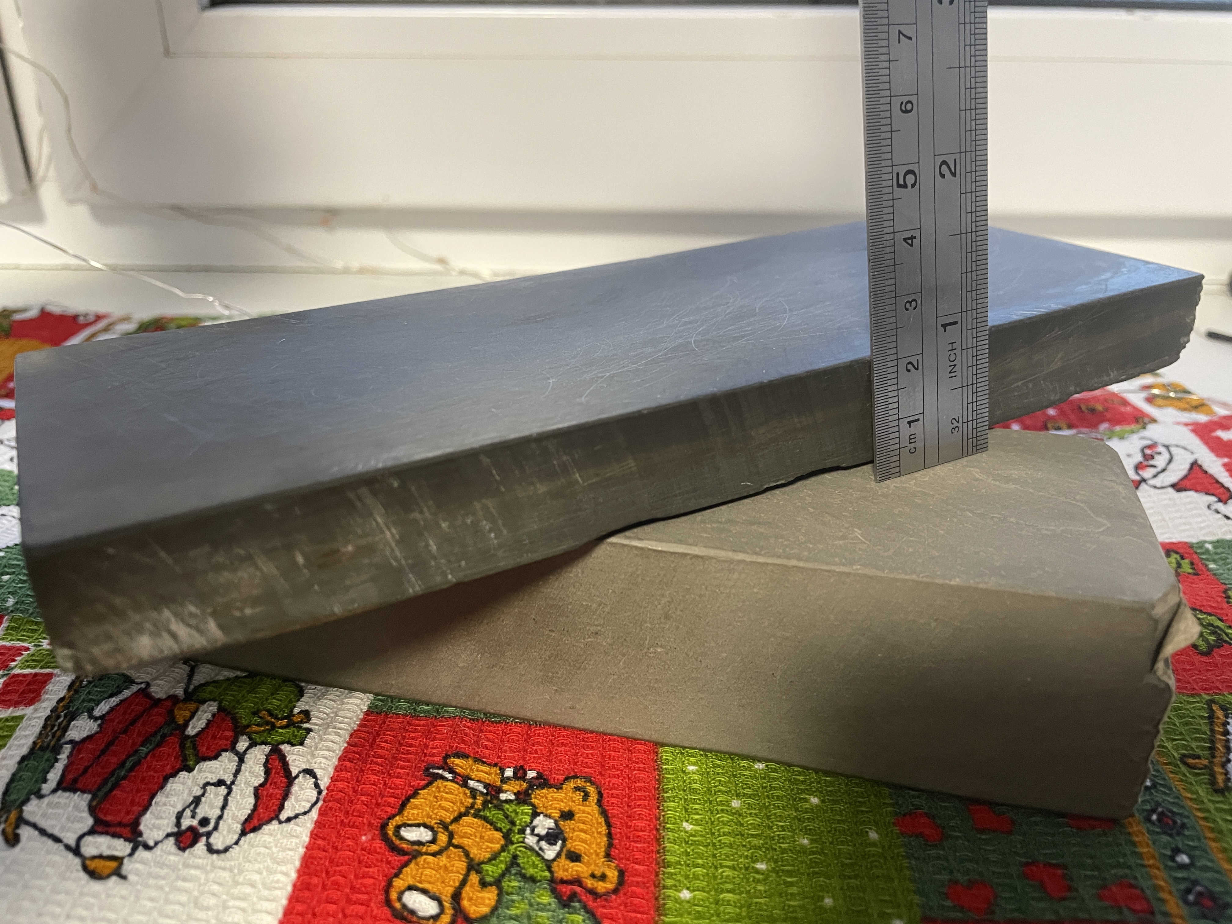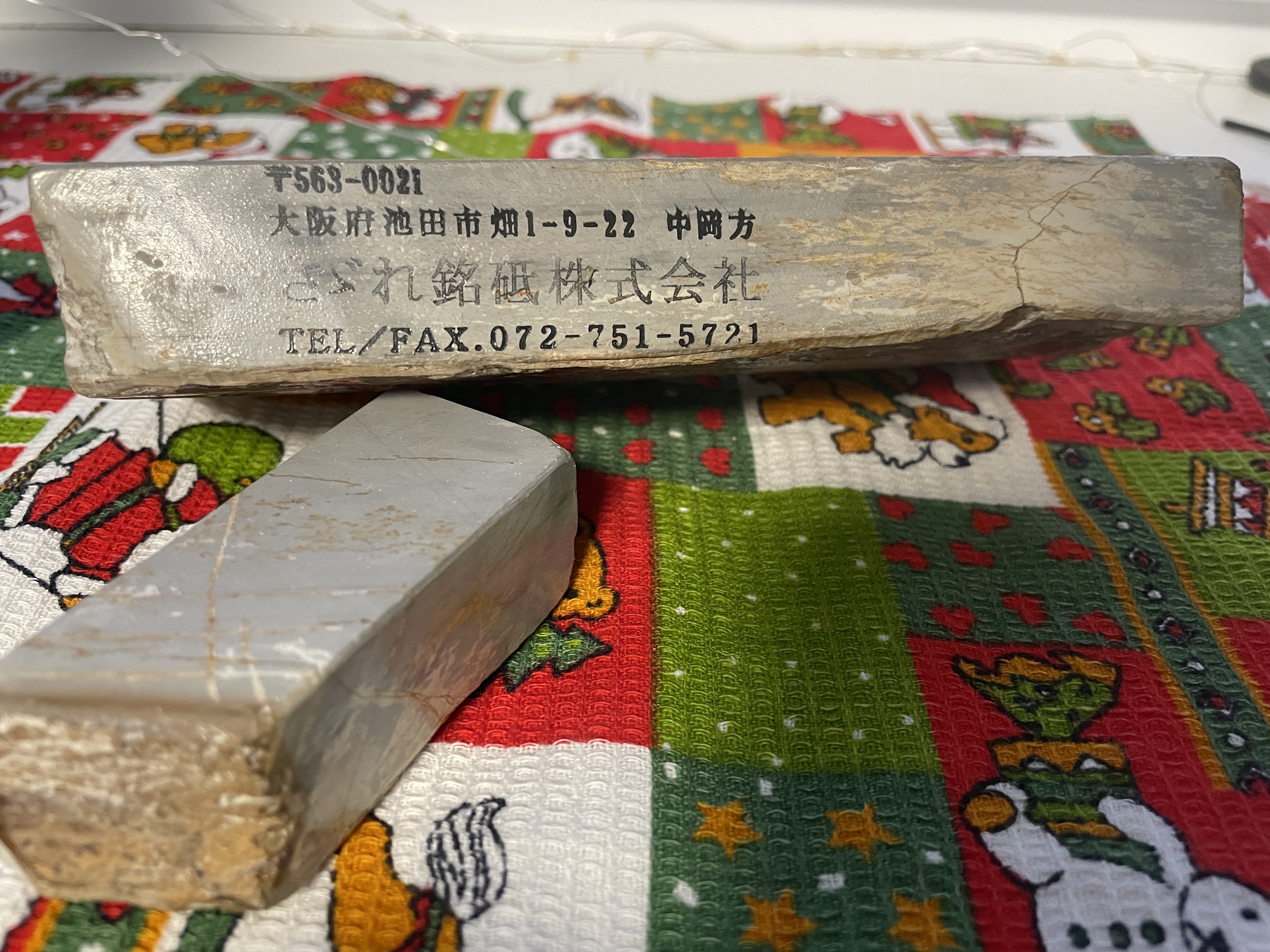 ОценкаВсем доброго дня. В 2008 году мне отец подарил дедовскую трофейную бритву. С тех пор я увлекся бритьем опасной бритвой. Со временем  прикупил для себя еще бритв, и конечно различных камней для заточки. Отобрал себе несколько водников на которых нравится затачивать, а остальные без дела лежат. У сына нет желания бриться опасной бритвой. Да, и ножи просит меня заточить. Находясь на пенсии, с финансами туже стало, пришел к выводу, что нужно продать водники, которыми не пользуюсь. Решился с вами посоветоваться о ценовой категории, чтобы, и камни продать, и не продешевить. [image]Это камень из провинции Guangxi его называют Chinese 12k). Размеры: 200 х 52х 23 мм вес - 877 гр томонагура - вес 63 гр 50х23х20 мм[/image] [image][/image] Nakayama uchigumori suita, голубой с белой крапинкой. 160 X 69 X 26 mm 698гр. Томо нагура 112 гр. 65х29х26 Жесткость (от 1 мягкий, твердый 5) 5 ++ Грит: (1 грубые, лучших 5) 3++++ Скорость резания: (медленный 1, быстрый 5) 3++ Сложность в использовании: (легкий 1, трудно 5) 3++++ Хорош для финишника. [image][/image] Третий камень 2000-ый Aoto Вес: 910 гр. 185х55х38