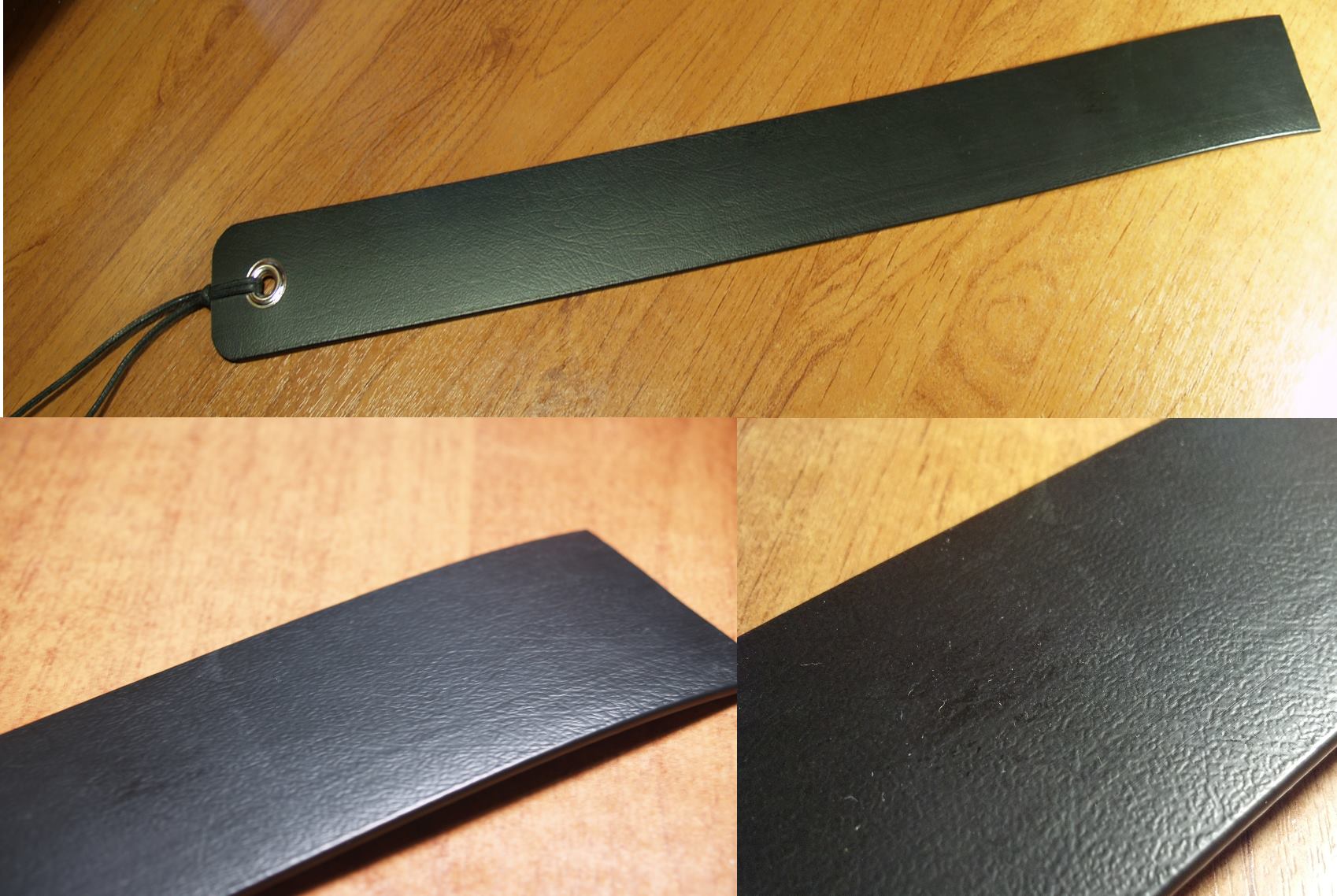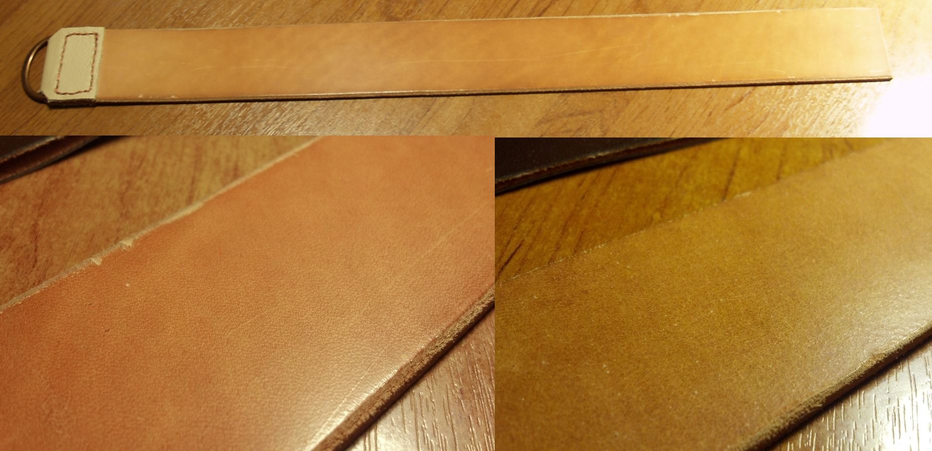 Ремень работает. Ширина –длина удобная. Вот по коже есть вопросы. Она крашеная, причем краска нанесена не фабрично на шкуру целиком с прониканием в массу, а «намазан» уже готовый ремень, о чем говорят следы на мездре. Зачем это было нужно – загадка. Жесткость высокая. Ход бритвы по ремню нечто среднее между натуральной кожей и синтетикой. Лично мне такая кожа кажется не вполне подходящей, хоть она и правит. Возможно это мои предрассудки. Но заказывать из-за бугра, тем более ждать очереди я б не стал.