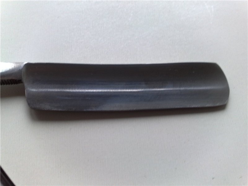 Почему-то в конце заточка с углом. На камень её и вывести плоскость! Кромка должна по всей длине сойтись... потом уже на ремне с ГОИ. Эту операцию проделывал много раз. Ремонт опасных бритв, звонить с 11-00 до 23-00, +79267729357, (whats app, telegram, VK), спросить Олега.