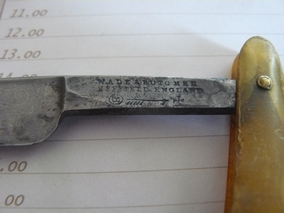 Насколько я знаю, это старая английская бритва из Шеффилда. По словам продавца, это конец 19 века. Но почему она такая "толстая", семь с небольшим мм, я имею в виду толщина обуха? Интересует примерный возраст и стоимость. Рукоять из рога, всего одна небольшая трещинка у пина. Да и вообще, накидайте информации побольше!