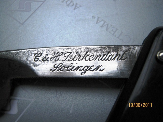 Re: KOBAR, BIRKASO, CARL и HUGO BIRKENDAHL (!*)Полотно бритвы хоть и потемневшее но не гнилое, реставрации вполне пригодно, я и не такие приводил в чувство, ну а на счет ручки мнение уже было сказано и я подтвержу, что есть смысл восстановить данную ручку путем наращивания нового пластика.  Вот пример: http://britva.ru/forum/viewtopic.php?p=17654#p17654" onclick="window.open(this.href);return false; Т.к. ручка белая, то белый пластик считаю найти будет не проблемно, так что дерзай  Re: KOBAR, BIRKASO, CARL и HUGO BIRKENDAHL (!*)Господа, коли уж указана тема HUGO BIRKENDAHL  выталкиваю на обсуждение  F. & H.BIRKENDAHL  SOLINGEN, информация скудная, упомянут в 1901-1910 гг. Очень вероятно что американец, может родственник или кооперация с американцем ? Вопрос ?
