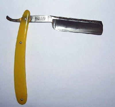 Ручка пластмассовая, желтая с инкрустацией серебром и перламутром, надписью «GLOBUSMEN SOLINGEN» c одной стороны. Бритва в идеальном состоянии. Имеет оригинальную упаковку с надписями: «Edmund Bergfeld & Sohn», «With the best silver steel of the world», «Globusmen Gold SOLINGEN», «Extra 46». Хочу получить подробную информацию о данной бритве. Фотографии бритвы можно увидеть ниже: