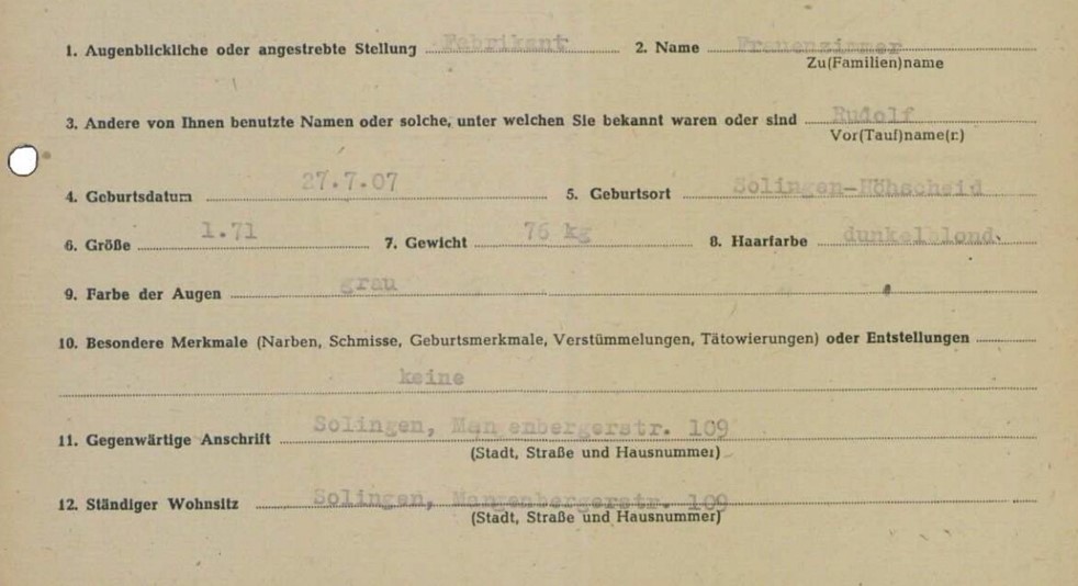 Rudolf Frauenzimmer родился в Золингене 27 июля 1907 года, после войны проживал по адресу MangenbergerStr. 109. В личном деле от 1946 года указан как фабрикант (т.е. производитель). Рост 171 см, вес 76 кг ( уж не знаю, зачем эта информация)