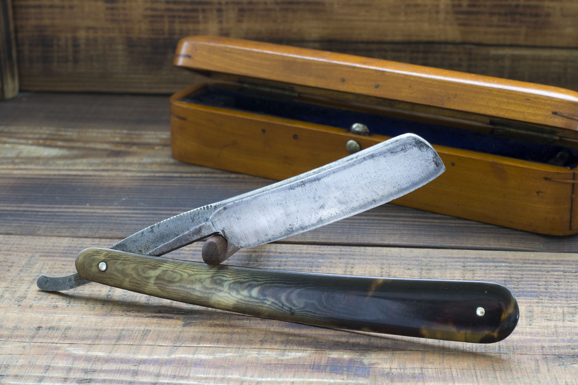 Так же интересны рукояти, я не сомневаюсь что это черепаха, но двевесный цвет в районе осевого пина вводит меня в ступор, возможно было воздействие какой то кислотой в попытке протравить. Так же буду рад мыслям по этому поводу. Ну и собственно фото.