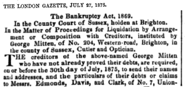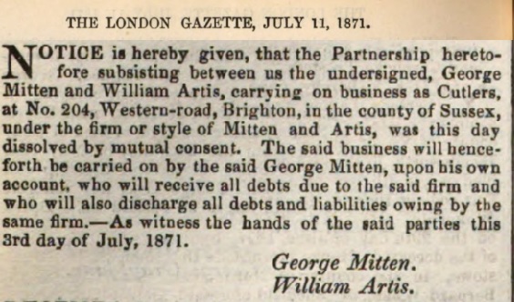 Spoiler Show William Artis из города Brighton, Англия, графство Сассекс. Начал бизнес до 1870 года (совместно с Georg Mitten). В 1871 году вышел из фирмы Mitten & Artis, в 1872 году обанкротился. До 1890 года начал новый бизнес по продаже ножей и бритв. Вероятнее всего в начале 1890х годов его фирма еще существовала. Больше упоминаний о нем в английских газетах нет.