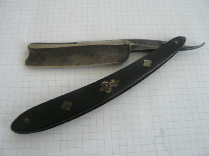 Насколько я знаю, это старая английская бритва из Шеффилда. По словам продавца, это конец 19 века. Но почему она такая "толстая", семь с небольшим мм, я имею в виду толщина обуха? Интересует примерный возраст и стоимость. Рукоять из рога, всего одна небольшая трещинка у пина. Да и вообще, накидайте информации побольше!