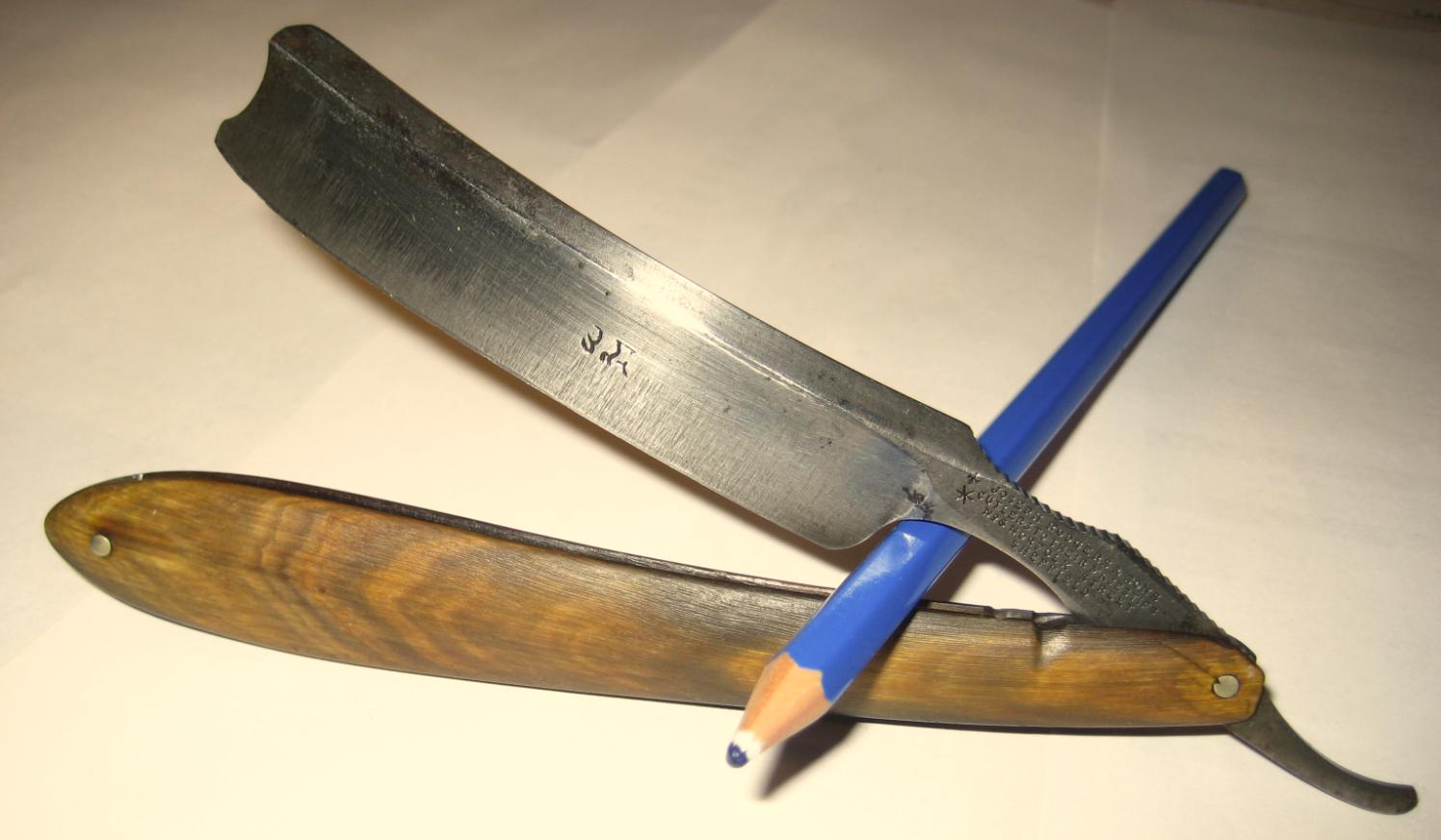 Однажды купил недорого вот такую старую бритву из-за необычной формы шейки. Ручка из рога в плохом состоянии, заклёпка серебро или "новое серебро", проставка между половинками ручек из серого металла. Но самое для меня интересное в этой бритве - это клеймо на лезвии. Уважаемые форумчане, кто что думает или знает достоверно по этому поводу (иероглиф или может конкретного мастера знак и т.д.)? Мне очень интересно Ваше мнение! А также как вам сама бритва и её приблизительный возраст?