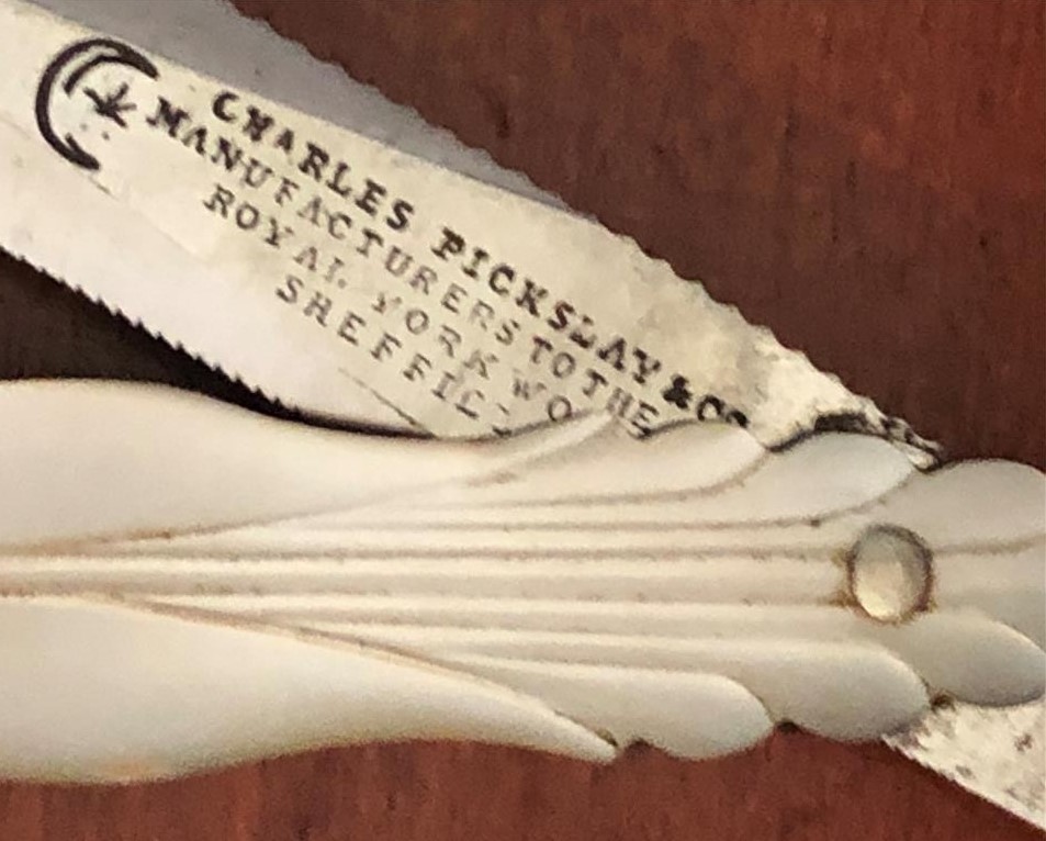 Q. Дата 1835. Производитель, Charles Pickslay & Co., Шеффилд, 1832-1843 гг. Надпись, звезда и полумесяц, а также «Чарльз Пиксли, королевский фабрикант, Royal York Works, Шеффилд». Ручка перламутровая.