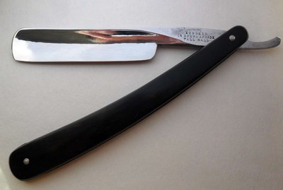 Ручка - рог, клинышек из металла. Судя по форме ручки, бритва конца XIX века, возможно, даже ближе к середине, но насчет этого не уверен, т.к. геометрия quarter hollow, не уверен, что в середине XIX века делали такие бритвы.