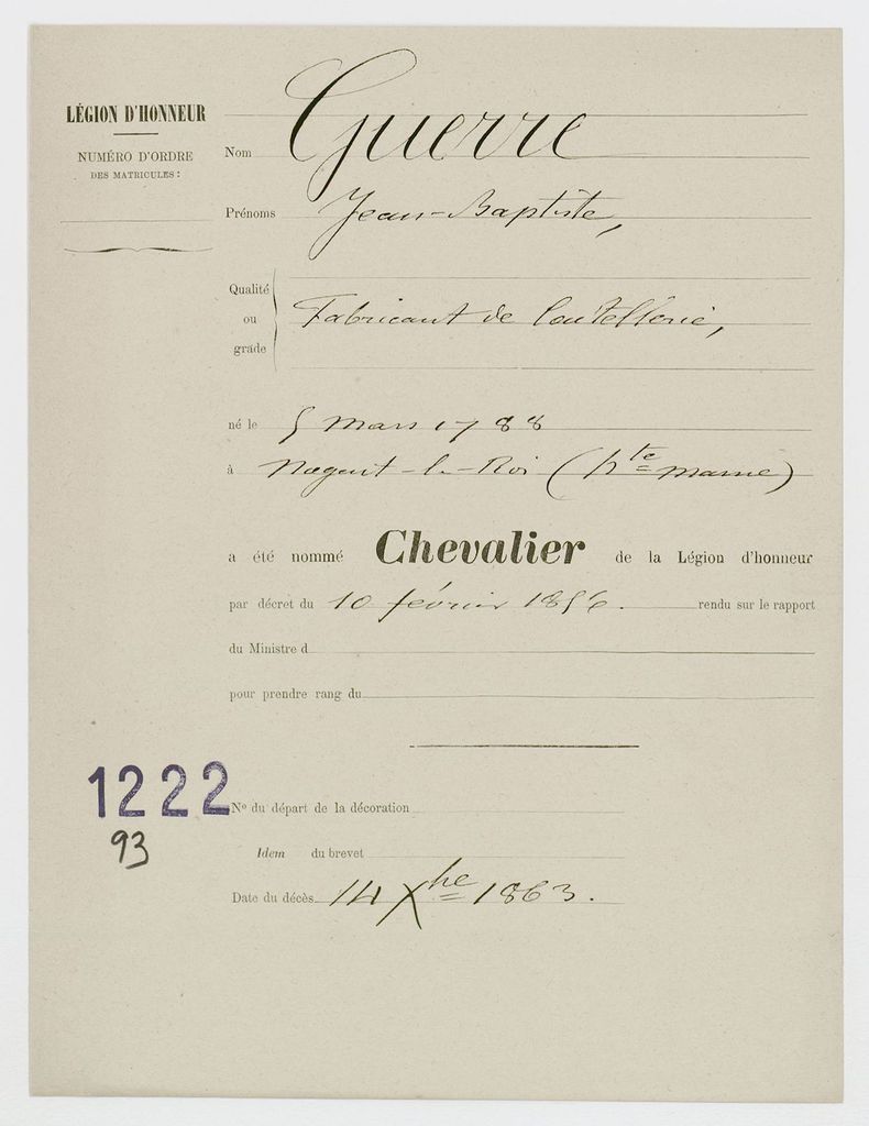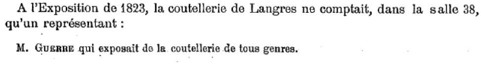 Жан Батист Герр (Jean Baptiste Guerre) родился 3.5.1788 в Лангре. Начал работать и получил выгоду от французской революции, чтобы основать свой бизнес и от наполеоновских войн, чтобы развить производство сабель, зажигалок и штыков... Герр был тесно связан с миссис Веуве Популус (Veuve Populus), с которой он, похоже, «ассоциировался» в ранние годы, и в итоге он сам стал мастером. В 1818 (по другим сведениям в 1812) году Герр основывает свое производство. С самого начала Жан Батист Герр демонстрировал тяжелую работу и упрямство: в 1819 году, например, он будет представлять свой город вместе с Популя Белин (Populus Belin) на выставке в Лувре (всего 2 представителя, тогда как Лангр в те годы мог похвастаться очень большим изобилием производств в этой отрасли). В 1923 году уже один он представлял Лангр на выставке в Лувре. До 1855 года он был на всех выставках, каждый раз медалист. вот немного упоминания в книгах, справочник от 1849 года, после получения очередной медали на выставке 1849 года. перевод: производитель ГЕРР, из Лангра (Haute-Marne) Он внес значительный вклад в улучшение столовых приборов Лангра и Ножана, создав новые модели, которые обычно отличаются своей художественной формой и оригинальным сочетанием. Ножницы и закрывающие ножи, отправленные на выставку, являются еще одним доказательством. Он был одним из первых ножовщиков во Франции, и его продукция часто экспортировалась в Персию и Южную Америку. В 1855 году, после первой всемирной выставки в Париже (Наполеон III был впечатлен лондонской выставкой в 1851 году, захотел провести свою) Наполеон хотел наградить достойных промышленников, получивших медаль на выставке 1855 года в Париже, чтобы показать свое величие и качество производимых товаров промышленностью Франции, тем самым утерев нос англичанам, после их выставки 1851 года. Жан-Батист Герр был посвящен в рыцари императорского ордена Почетного легиона, с этого момента он начал изображать крест легиона на своих бритвах (а также императорскую корону, которую можно найти на многих бритвах XIX столетия). Это императорский указ от 10 февраля 1856 года: В начале 1860-х годов бразды правления компанией переходят от Жана Батиста к его сыну - Шарлю Герру. Именно Шарль Герр взял медали на выставках 1862, 1867, 1872 годов. Жан-Батист Герр умрет 14.12.1963 К концу жизни Шарля Герра, в конце 1860-х и начале 1870-х годов, возникло небольшое противоречие: рабочие Ножана пожаловались (я так понимаю из-за того, что хотели признания своей работы, а учитывая то, каким крупным и богатым было производства Герре, это выглядит логичным), что с 1860-х годов компания Герра не делала бритвы в Лангре, которые на самом деле производились работающими семьями Ножана, а компания, в свою очередь, обеспечивала только сырье и «контроль качества». И, если я правильно понял, рабочие семьи Ножана создали кооператив и имели небольшое соперничество в качестве с производимыми бритвами в Лангре. Помимо самого бренда «Guerre fils», Шарль указывает на бритвах города производства как Nogent так и Langres с 1870-х годов. Шарль Герр умер в 1876 году, и компания перешла к его племяннику Эмилю Женевуа - Герру (Emile Genevoix - Guerre), который также будет производить в Ножане, городе, который в то время имел худшую репутацию в сфере столовых приборов. В 19 веке в Лангре компания Guerre была самым важным и лучшим производителем столовых приборов высокого и высшего качества (класса люкс).