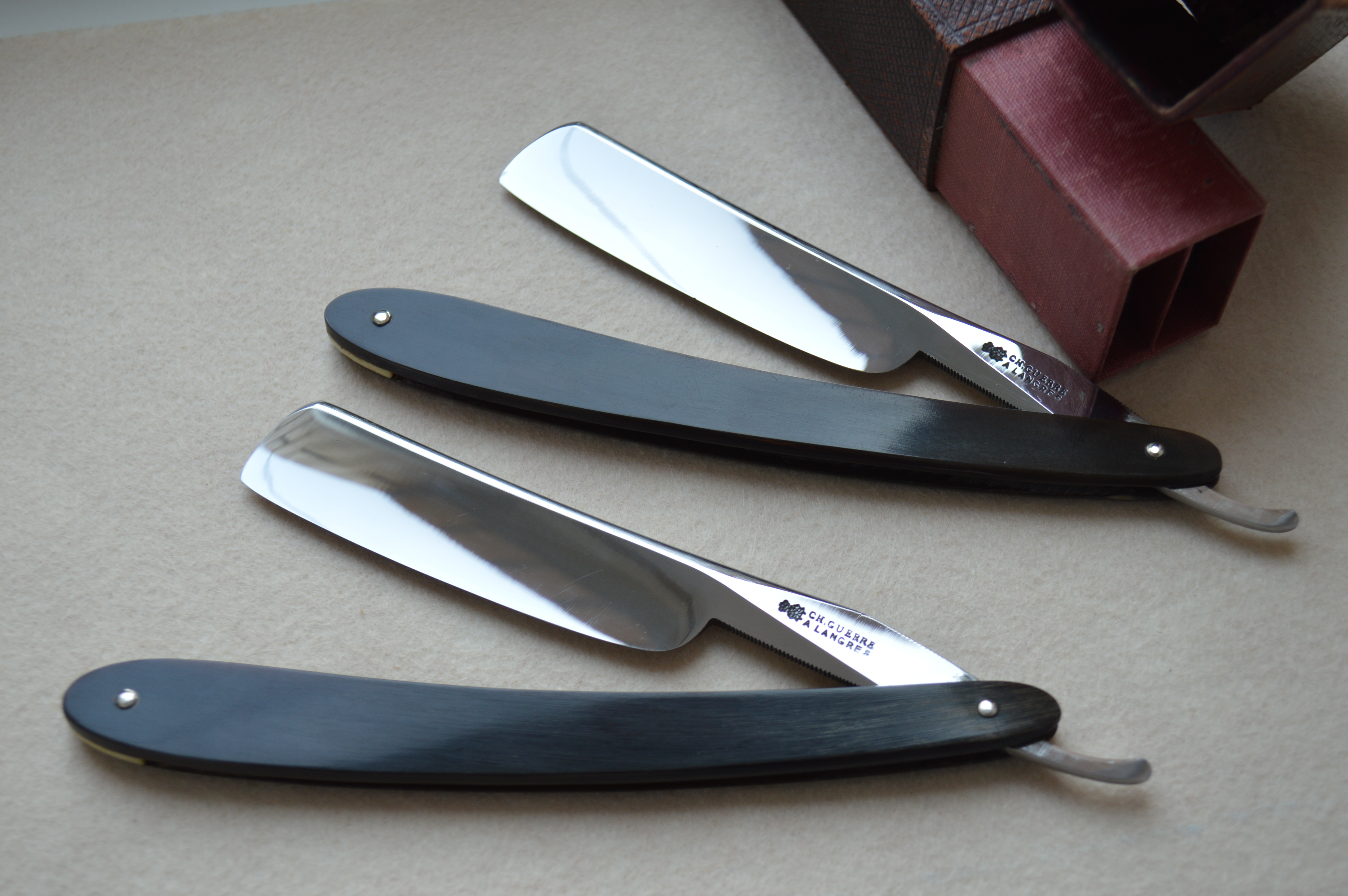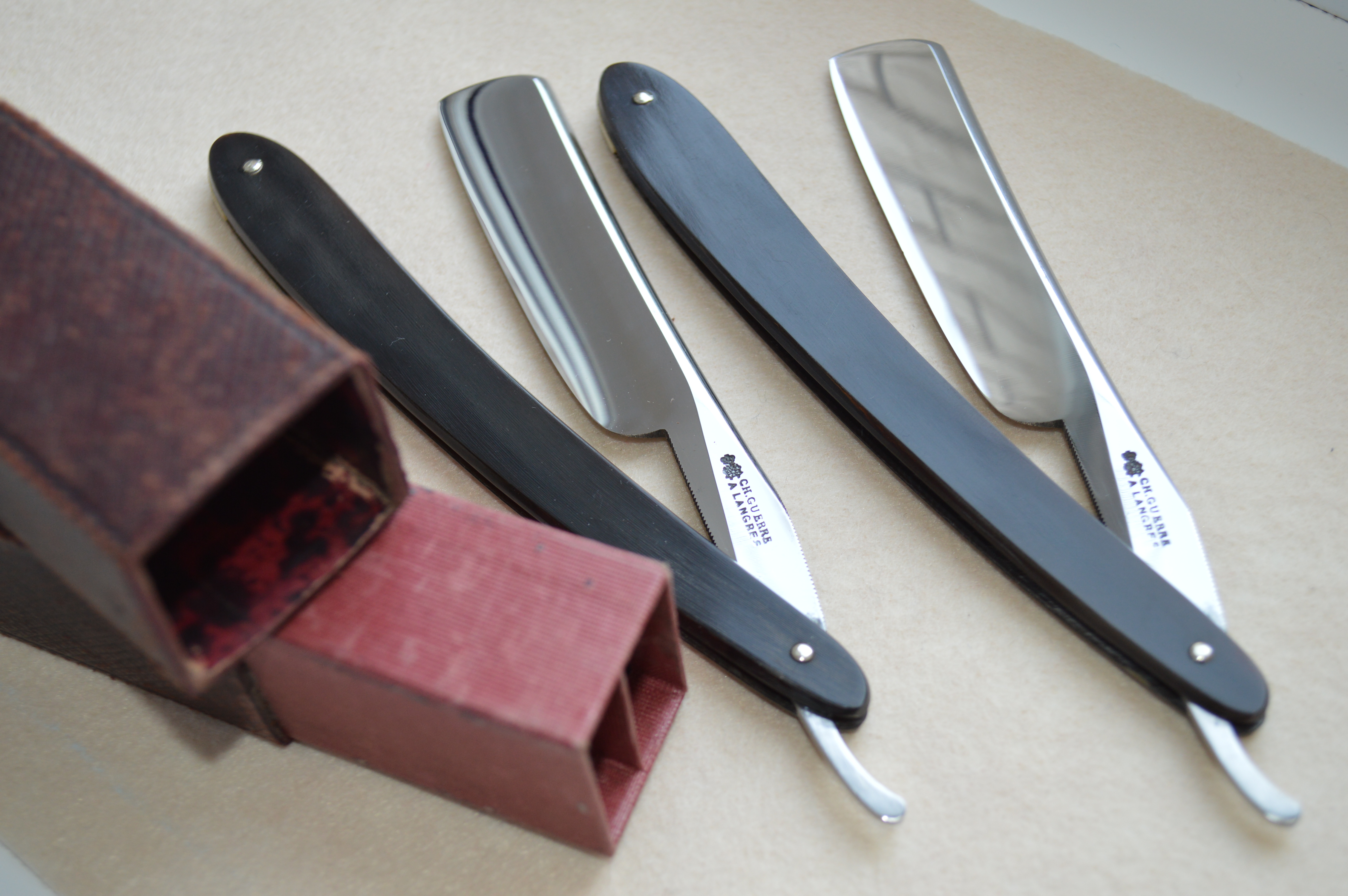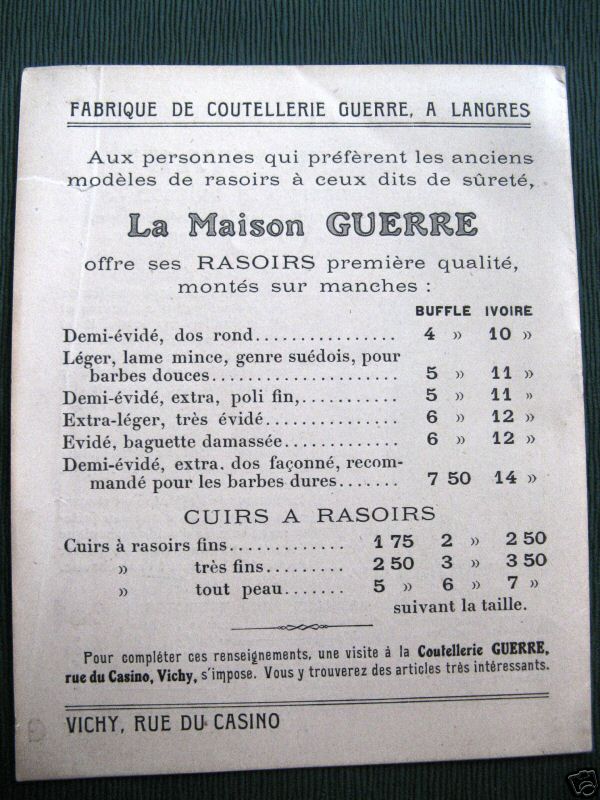 Так же погулял по сети и позаимствовал немного фото у французского форума. Есть пара музейных бритв из Лангра и еще один Guerre в черепахе. Производитель явно неординарный, видно по качеству исполнения. Кроме того спрос на бритвы Guerre стабильно высокий, не раз видел как торги на ебэй доходили до внушительных сумм. Мне, как и писал выше, моя пара досталась исключительно из за привередливости продавца, который не отправлял за пределы Франции и не принимал других способов оплаты кроме чека. История занимательная. Пришлось в итоге просить своего знакомого во Франции чтобы он выписал чек, отправил его в письме, а после сходил на почту для получения и переслал бритвы на мой адрес в Россию. За что ему огромное спасибо.
