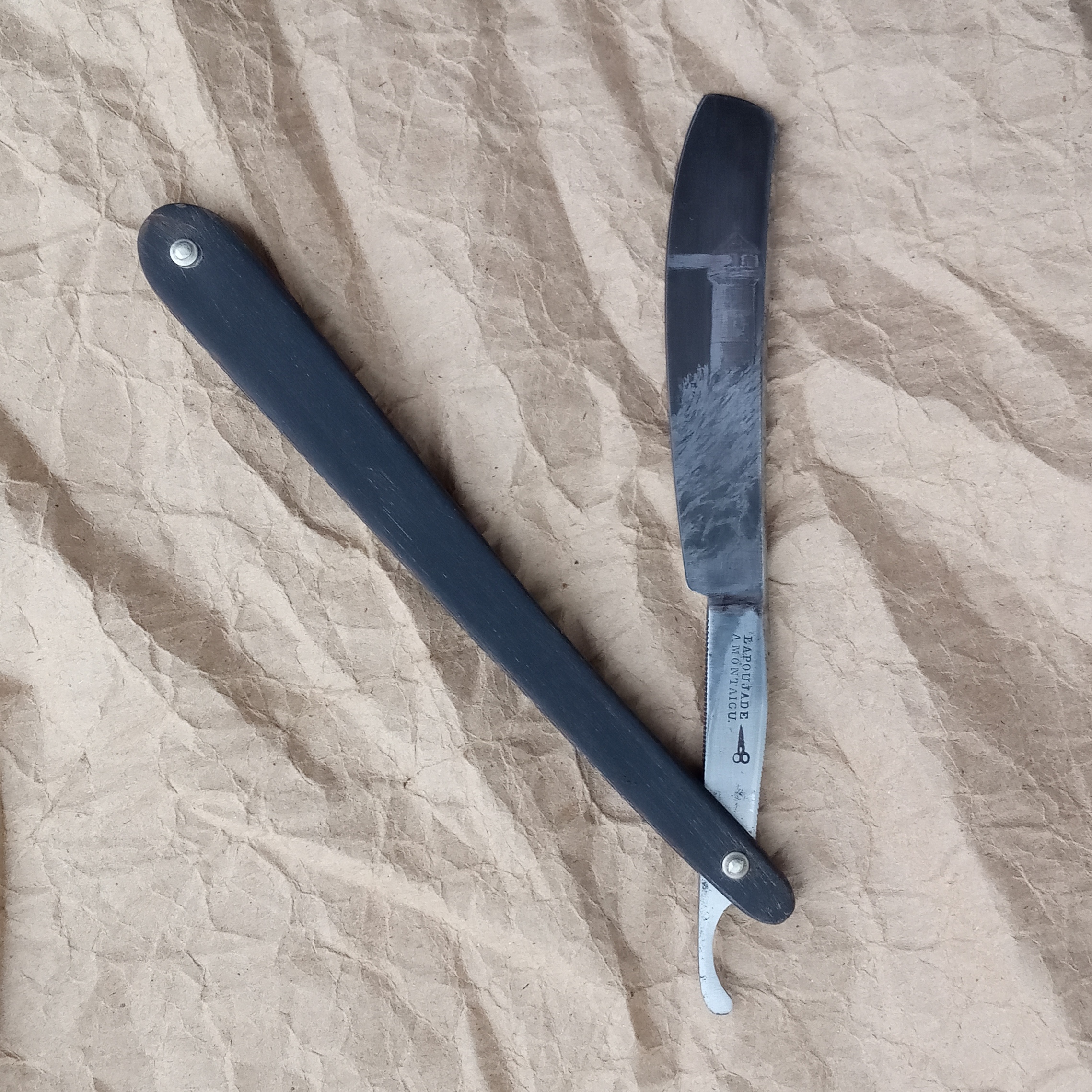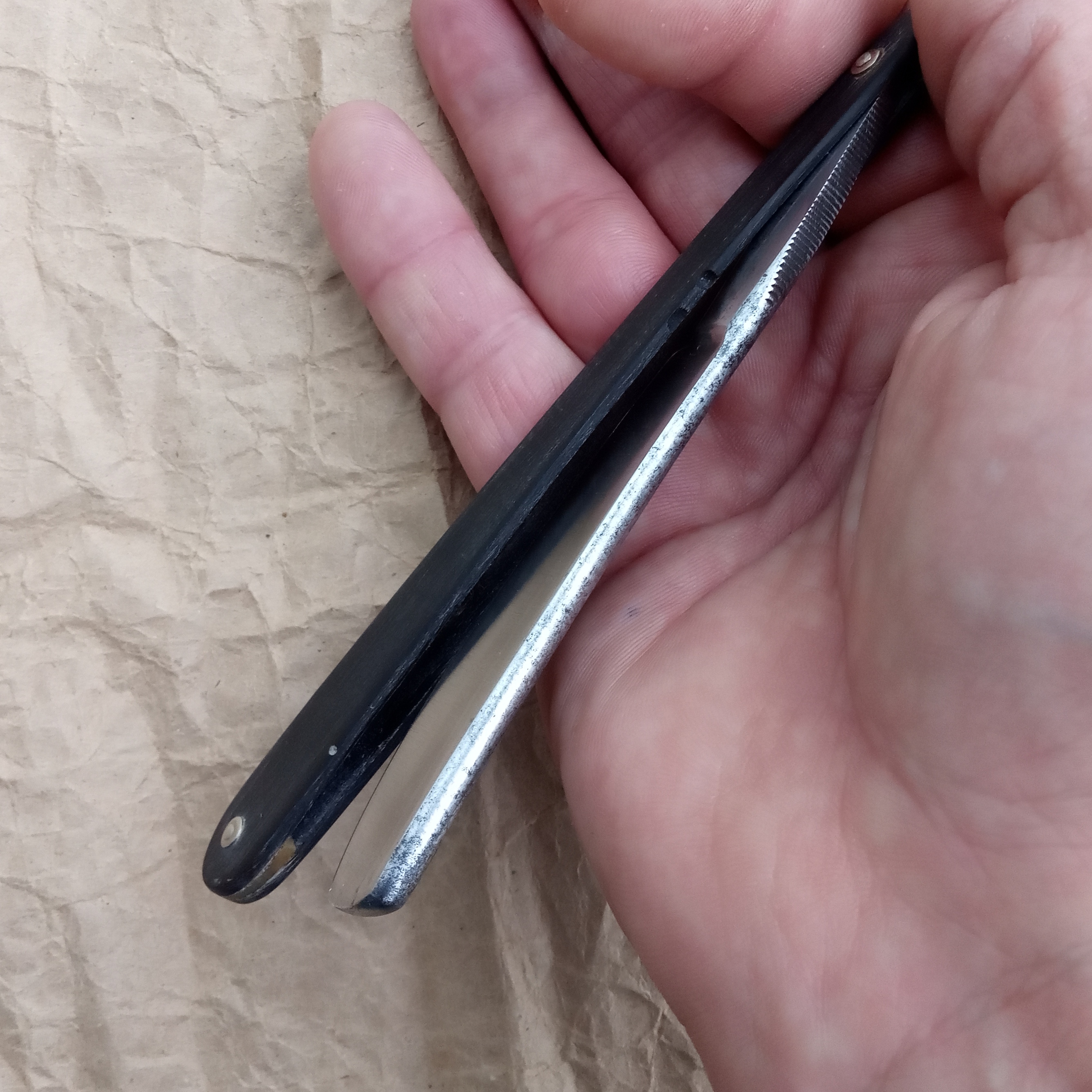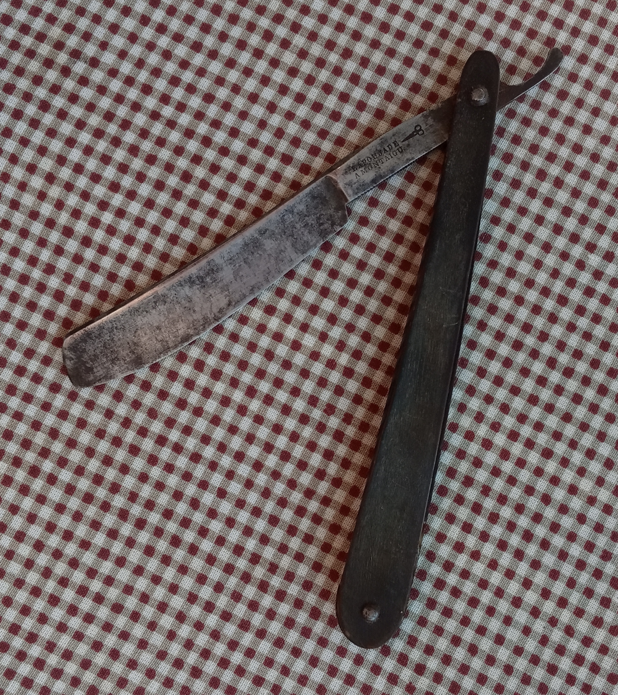 Похоже, бритва второй половины ХIХ века. Кроме надписи ножницы на эрле и непонятный штамп возле осевого