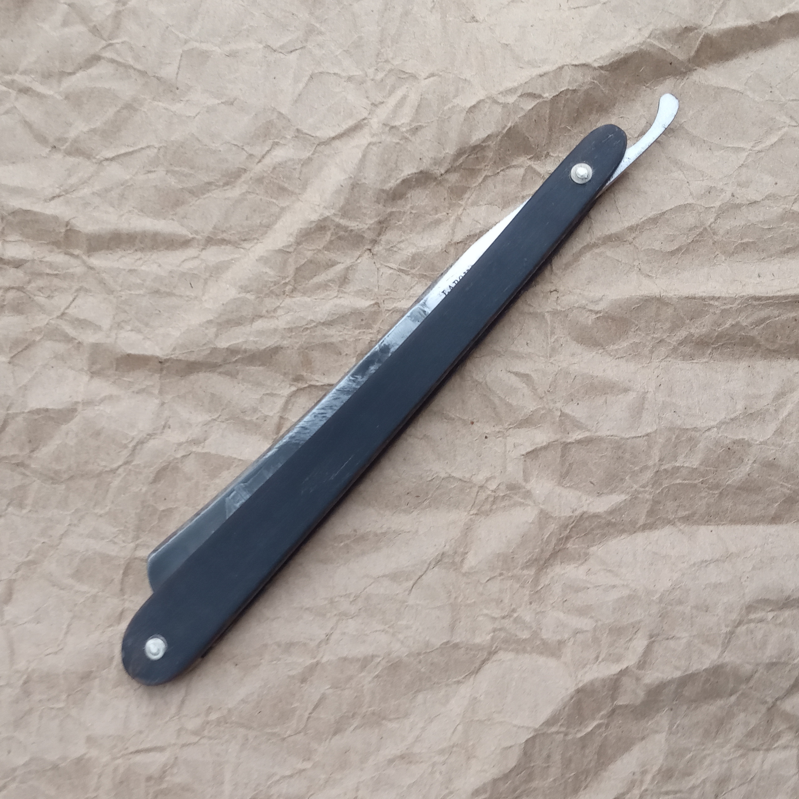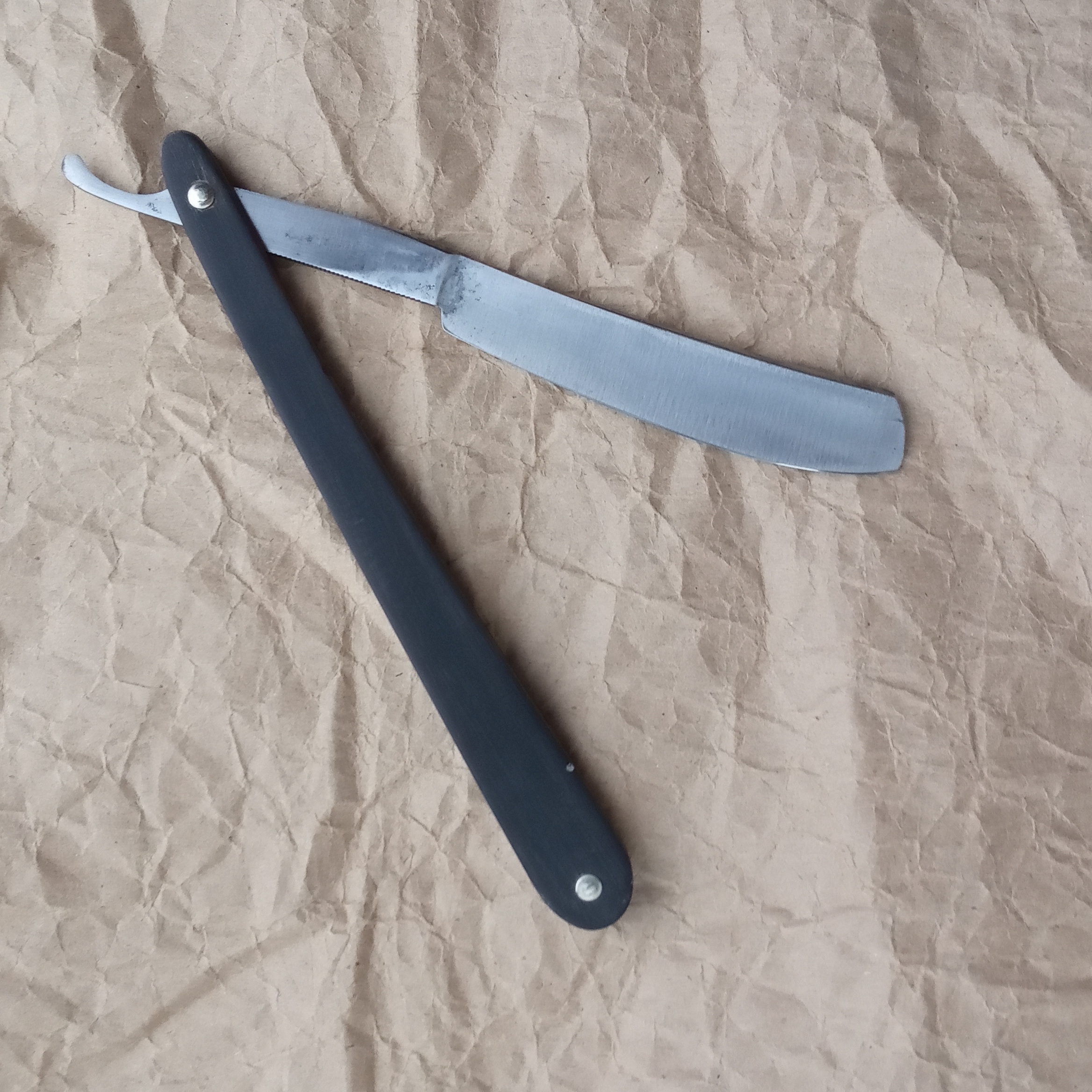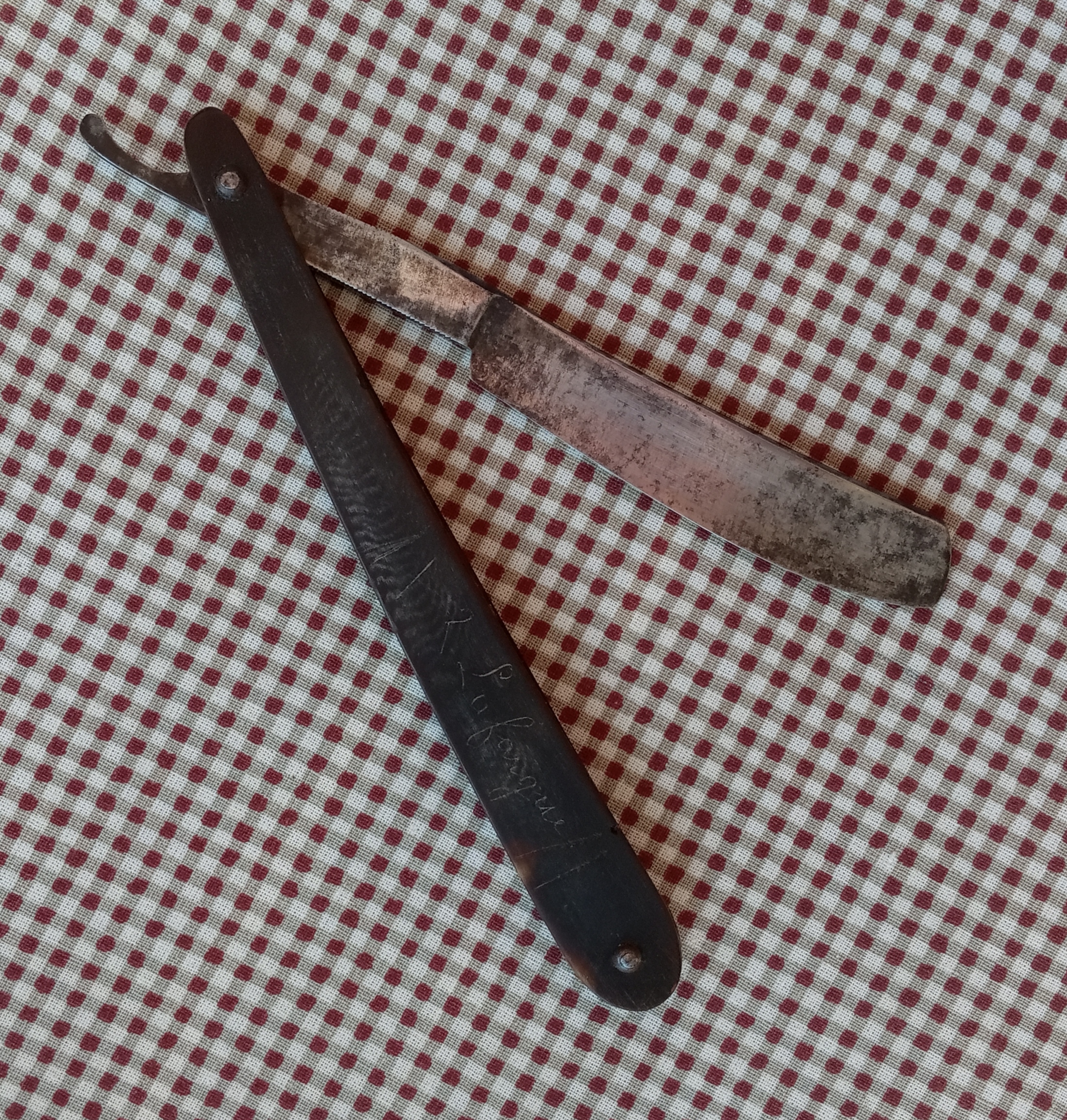 Похоже, бритва второй половины ХIХ века. Кроме надписи ножницы на эрле и непонятный штамп возле осевого