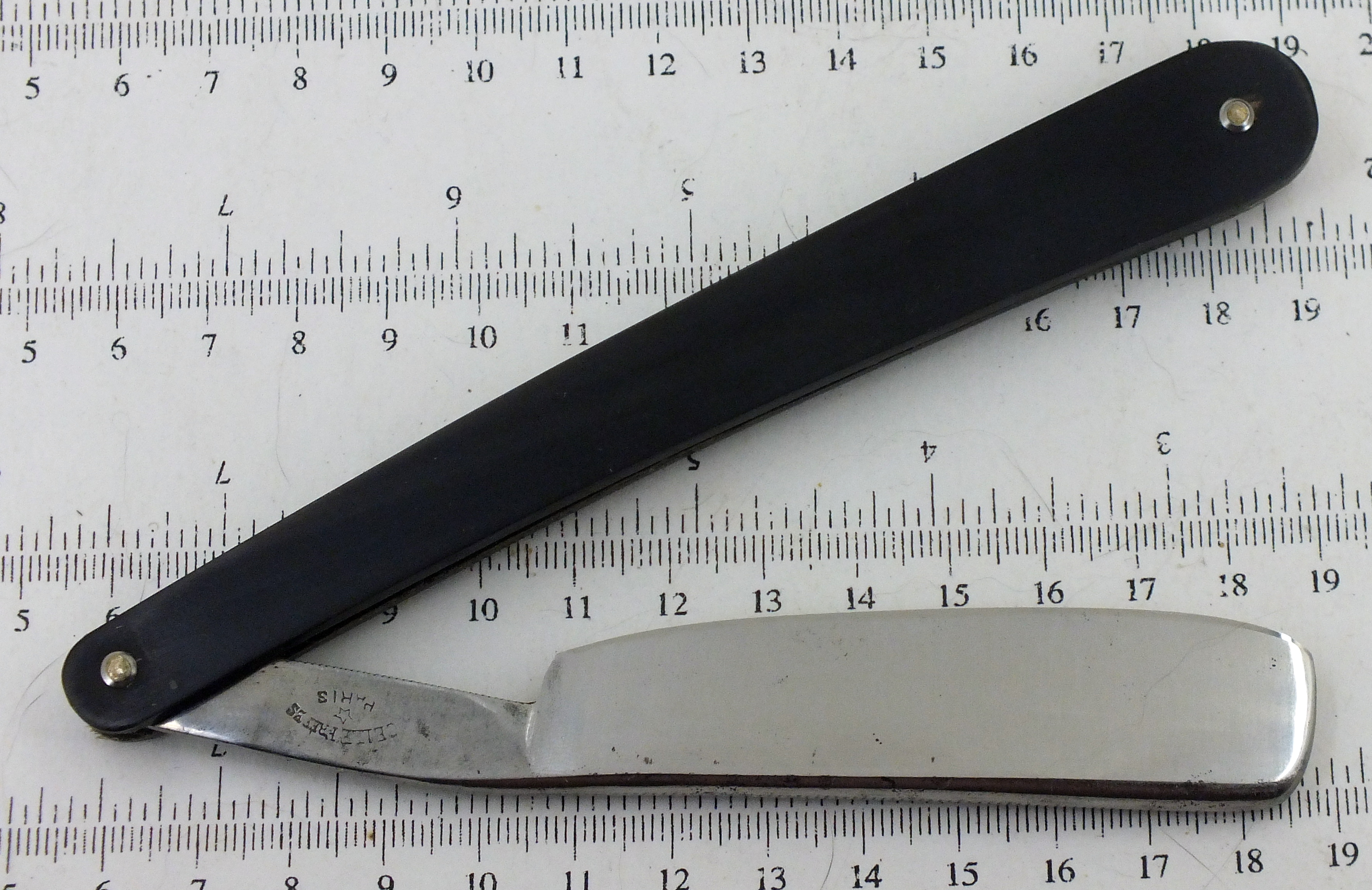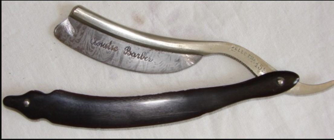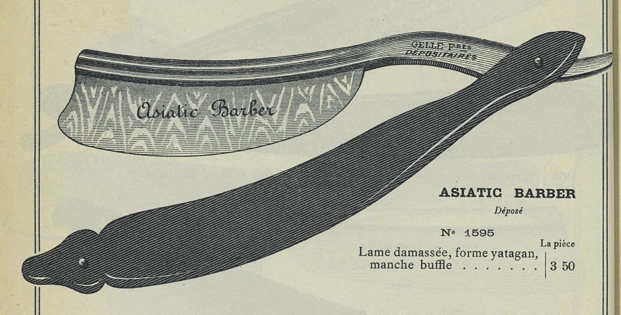 номер 1595, "азиатский парикмахер", лезвие дамасское, форма ятагана, ручка рог буйвола. (это перевод описания бритвы)