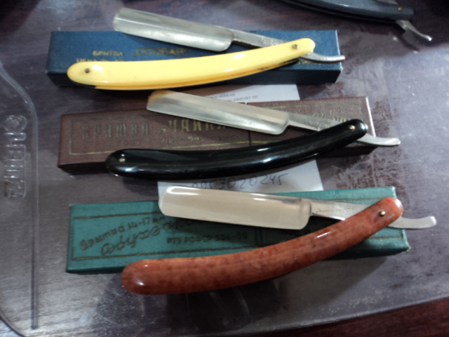 Re: Добыча с барахолкиНа Флитт-Стрит хорошая погода.... Барыги поперли свежий товар.... Вачи - Чайка 1955 , Двухзаковная 1967, Стиз-Ракета,Особая-обе1970 - состояние NOS.... Осталась еще одна Чайка -надеюсь купить на следующей неделе, маргеналы с молдаванки подогнали чудную черпачную кожу,а бабуля продала мужеву бритвенную Стизовскую правилку.... На все хотелки не хватило деньжат!!!!! д.Вова-барыга притарабанил из Цюрюпинска Вачу Гравюра "СОЧИ"-бабла хотел 150у.е Экземпляр остался дожидаться своего фаната покупателя.... В коробке хлам по 10 баксов.....Была какая-то Англичанка , или шведка-надпись ШЕФФИЛД СТИЛЛ, с ломаной ручкой , жаль не сообразил сделать фото ...Выходной прошел не зря...
