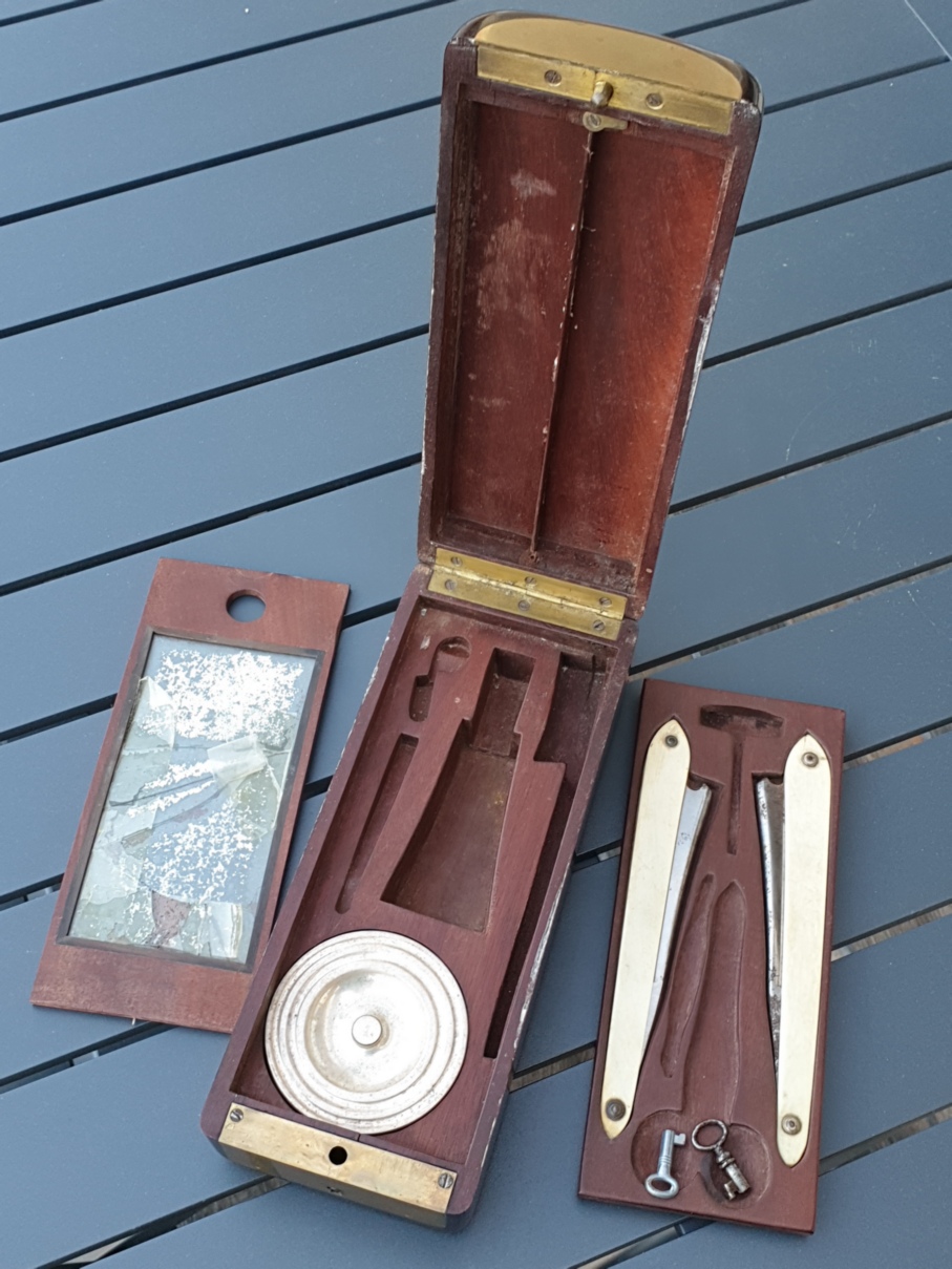 Привез только что из Франции, купил в антикварной комиссионке в Экс-ан-Провансе. Шкатулка в рабочем состоянии, с ключами, замок и петли исправны. Оба бесхвостых клина - производства ***LET A PARIS, оправы из слоника, всё в отличном для своих лет состоянии. Удачная находка.