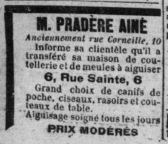PRADERE AINE . 6, rue Sainte, MARSEILLEПервая реклама этого магазина (или бизнеса ножовщика PRADÈRE AÎNÉ) встретилась  в газете Le Petit Marseillais, 4 января 1896 года: