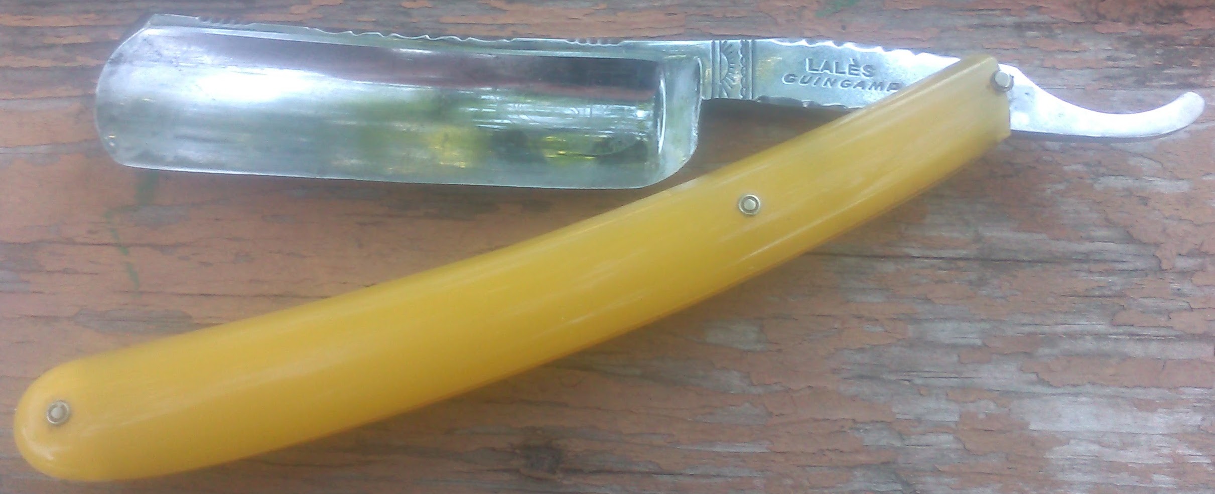 Помогите определить бритвуПопала в руки вот эта бритва но информации по фирме и модели найти не могу. Предполагаю что она французская. У бритвы два дефекта, поломана ручка (без клейм), и перпендикулярная трещина на режущей кромке около 5 мм. Надеюсь на Вашу помощь
