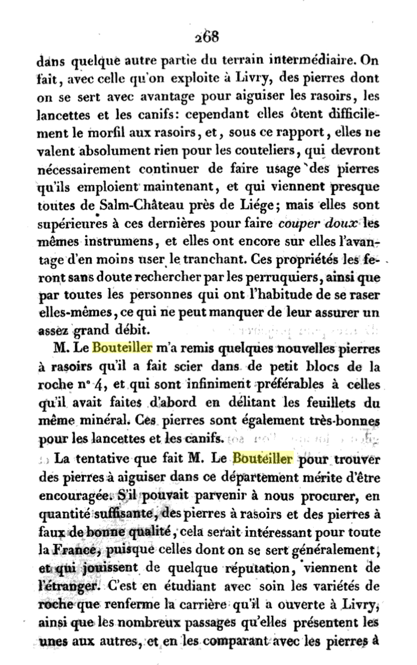 Еще один француз.И насчет текста из старинной книги "Анналы...". Загрузил в онлайн-распознавание текста от Abbyy и затем в гуглопереводчик. Речь идет о M. Le Bouteiller, который занимается поиском и изучением заточных камней для бритв, скальпелей и ножей из карьера в Livry. Автор статьи хвалит его камни, мол они даже лучше известных Salm-Château, т.к. делают более "мягким" инструмент (рез?).