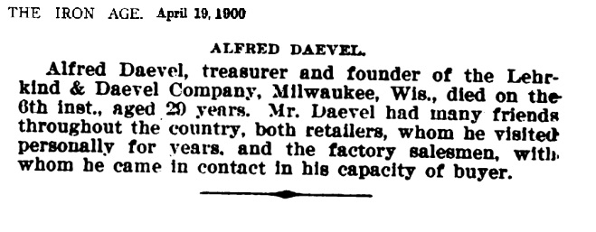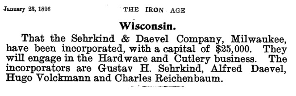Начали бизнес в конце 1895 года, в январском журнале за 1896 год есть упоминание о начале бизнеса с капиталом в 25 000 долларов: Продажи хозтоваров (скобяных изделий) и ножевых изделий. Причем, в журнале, опечатка в фамилии. а в 1900 году основатель фирмы Alfred Daevel умирает, в возрасте 29 лет. Некролог найден в апрельском номере журнала Iron Age После этого упоминаний в прессе о этой фирме нет.