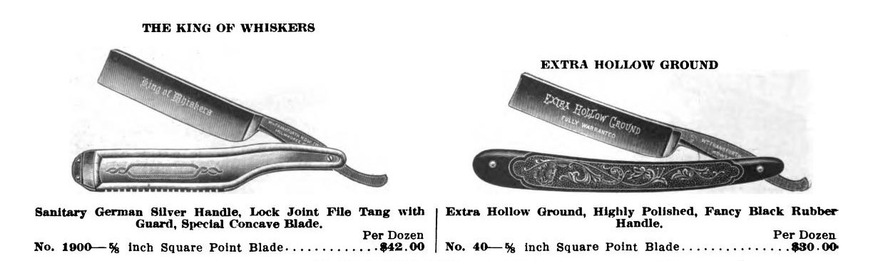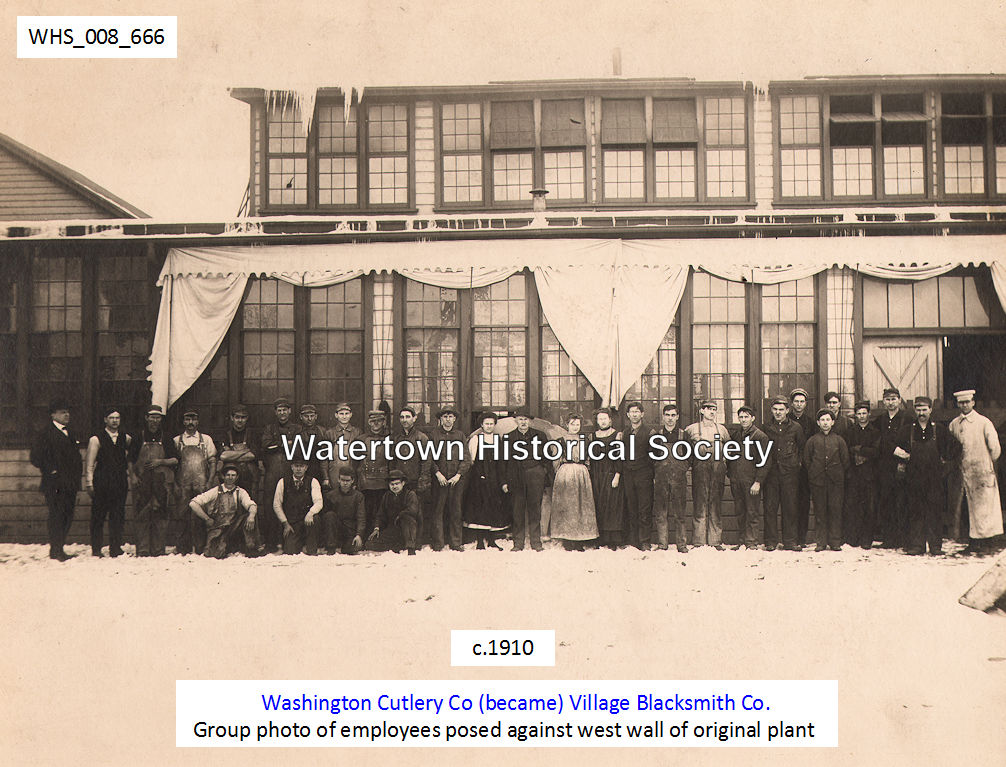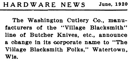 к 1921 году компания выпускала ножевой и инструментальной продукции от 700 000 до 1 000 000 экземпляров в год. Еще в 1903 году Washington Cutlery Co зарегистрировала торговую марку "Village Blacksmith". Spoiler Show "The Village Blacksmith Folks". Это произошло в июне 1920 года.Бритв выпущенных с этим названием не найдено, поэтому дальнейшую историю предприятия опустим. Для интересующихся: о ней можно почитать на сайте http://www.watertownhistory.org/Article ... ksmith.htm Добавлю лишь, в 1956 году отмечалось 50е летие завода. В газете "Watertown Daily Times" от 17.03. 1956 года вышла заметка, в которой говориться, что фирма основана 62 года назад. Значит в 1894 году и их история начинается с Lehrkind & Daevel Сo. Spoiler Show