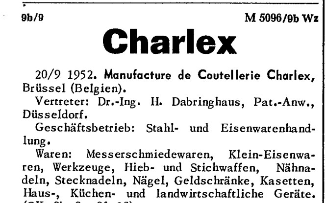 ( https://hetarchief.be/en/media/la-derni ... ch=Charlex" onclick="window.open(this.href);return false; ) До третьего рейха еще 20 лет... ))) Тут явно производитель не указан, но торговая марка Charlex принадлежала Charles Hake, бельгийскому производителю, который работал с 1900 по 1949 годы, и зарегистрирована в Бельгии в 1911 году - столовые приборы, гвозди, ножницы, бритвы и т.д. Добавлено спустя 26 минут 31 секунду: кстати, торговые марки, которые указаны на рекламе: DIABOLO EPATANT RESISTANT FORGERON тоже принадлежат Charles Hake и зарегистрированны в начале вка так что forge evide простой заказчик, возможно бельгиец или бритвы заказывал для Бельгии Добавлено спустя 43 минуты 26 секунд: гм... открыл словарь forgé & évidé à solingen кованная и сделанная полой в Золингене. Полая в смысле Холлоу. и ни фига это не имя производителя или заказчика, а не прижившийся французский термин. так что бритва от Charles Hake, Бельгия Добавлено спустя 1 час 24 минуты 4 секунды: вот эта бритва: для начала в интернете неверно полагают, что фирма Charles Hake работала до 1949 года. минимум до 1958: и тут мы видим, что торговой марки Colibri в 1949 году еще не было, а документе от 1958 она появилась. Вот и весь развод от продавцов про рейхи, а Колибри делалась в 50х годах. А Charlex с 1911 по 1958 годы (минимум)