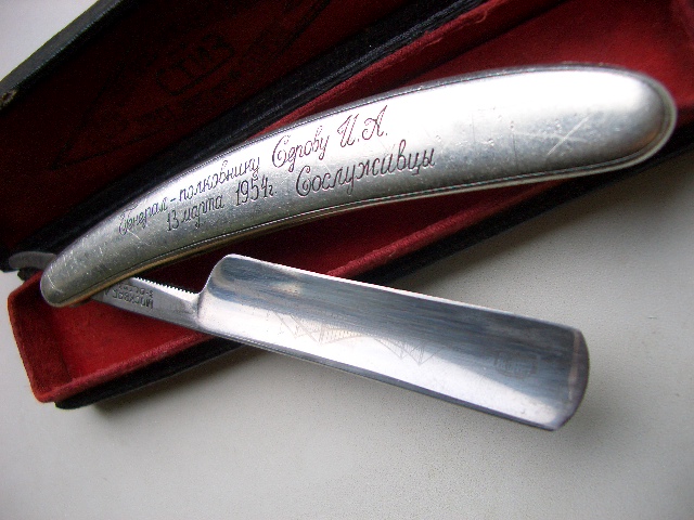 А инэт-то нафиг? Знаменитая бритва! Вот удача, повезло. Читайте: С марта 1954 года - председатель Комитета государственной безопасности (КГБ) при Совете Министров СССР. Вот это высокий ранг! Вот это бритва! Думаю это и есть причина подарка! Ни хрена себе чего ты в растворе замочил! Фигасе самопал! Читайте всё: Серов Иван Александрович - заместитель Народного Комиссара внутренних дел СССР, заместитель командующего войсками 1-го Белорусского фронта по делам гражданской администрации, генерал-полковник. Родился 25 августа 1905 года в селе Офимское Вологодского уезда Вологодской губернии, ныне Сокольского района Вологодской области, в крестьянской семье. Русский. Член ВКП(б)/КПСС с 1925 года. В Красной Армии с 1925 года, став курсантом Ленинградского артиллерийского военного училища. С 1928 года проходил службу в 22-й стрелковой дивизии: командиром взвода, помощником командира батареи, командиром батареи, помощником начальника штаба полка, начальником штаба полка. С 1935 года - слушатель Военной академии имени М.В. Фрунзе, которую окончил в 1939 году. С 9 февраля 1939 года И.А. Серов - заместитель начальника, с 18 февраля 1939 года - начальник Главного управления Рабоче-крестьянской милиции НКВД СССР. С 29 июля 1939 года - заместитель начальника Главного управления государственной безопасности НКВД СССР - начальник секретно-политического отдела. С сентября 1939 года нарком внутренних дел Украинской ССР. В феврале-июле 1941 года - первый заместитель наркома государственной безопасности СССР. В годы Великой Отечественной войны и в послевоенные годы, с июля 1941 года по февраль 1947 года Серов И.А. - заместитель наркома (с марта 1946 года - министра) внутренних дел СССР. Одновременно в апреле - июне 1945 года он заместитель командующего войсками 1-го Белорусского фронта по делам гражданской администрации. За умелое руководство делами, как в наркомате внутренних дел, так и в должности заместителя командующего фронтом и проявленные при этом решительность и мужество Указом Президиума Верховного Совета СССР от 29 мая 1945 года генерал-полковнику Серову Ивану Александровичу присвоено звание Героя Советского Союза с вручением ордена Ленина и медали «Золотая Звезда» (№ 6453). В июне 1945 года - ноябре 1946 года И.А. Серов - заместитель Главноначальствующего советской военной администрации в Германии по делам гражданской администрации. С февраля 1947 года - первый заместитель министра внутренних дел СССР. С марта 1954 года - председатель Комитета государственной безопасности (КГБ) при Совете Министров СССР. Указом Президиума Верховного Совета СССР от 8 августа 1955 года генерал-полковнику Серову И.А. присвоено высшее воинское звание «генерал армии». С декабря 1958 года генерал армии Серов И.А. - начальник Главного разведывательного управления (ГРУ) - заместитель начальника Генерального штаба Вооруженных Сил СССР. Депутат Верховного Совета СССР 1-го, 2-го, 5-го созывов. Член ЦК КПСС в 1956-1961 годах (кандидат в 1941-1956 годах). После разоблачения шпионской деятельности полковника ГРУ Пеньковского О.А., его бывший непосредственный начальник генерал армии Серов И.А. был обвинён в «потере бдительности» во вверенном ему Управлении и Указом Президиума Верховного Совета СССР от 12 марта 1963 года лишён звания Героя Советского Союза и ордена Ленина (Обана! прим Олег Бритва) . Понижен в воинском звании до генерал-майора. 