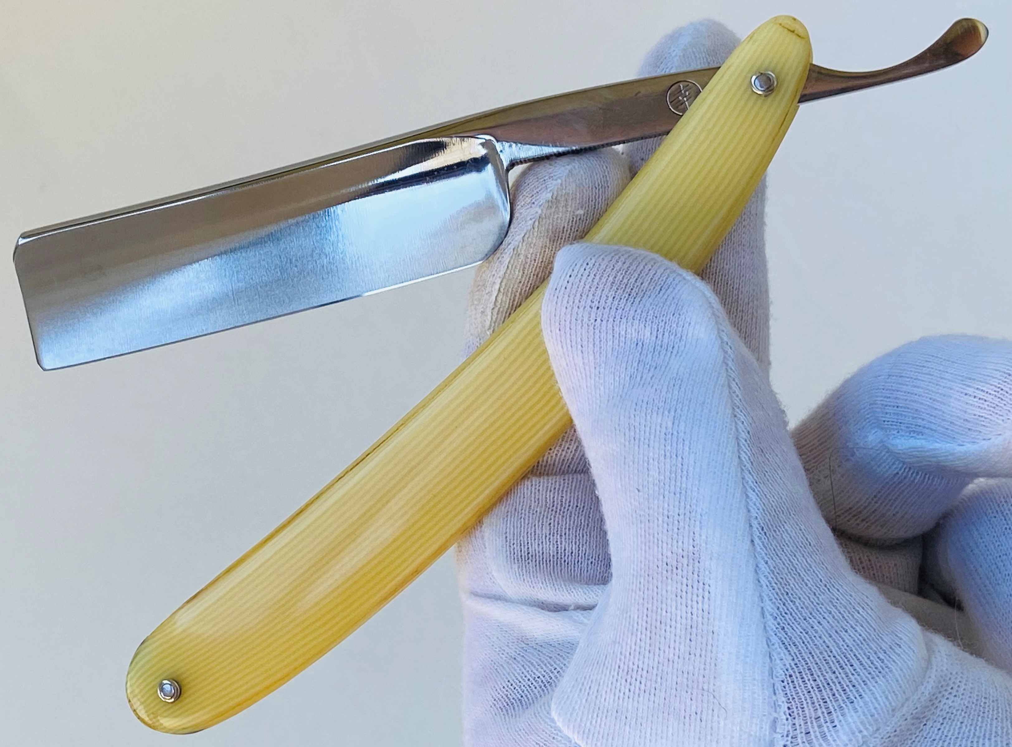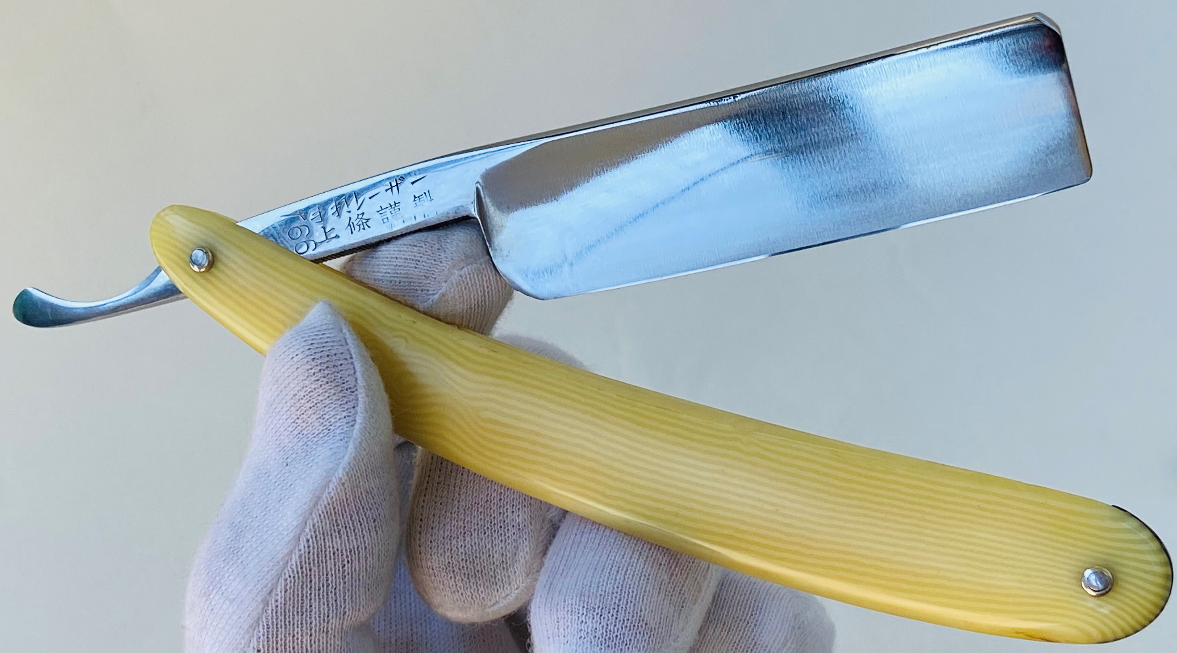Не часто можно увидеть японскую бритву, по форме лезвия очень напоминающую английскую классику,рубежа 19-20-х веков.Мое мнение, что Камиджо Юкио брал за основу именно английские бритвы того периода, как наиболее удобные в обращении.