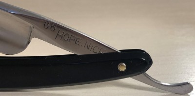 В отличие от первой бритвы 66 HOPE NICE, где оригинальная шлифовка и полировка клинка представляла собой стандартный гринд на шлифовальной машине, то в данном случае клинок обрабатывался чисто руками мастера, с использованием натуральных камней, по принципу полировки катаны..( Если бы знал, какой геморрой ждет меня, чтобы попробовать воспроизвести эту работу и хоть как то приблизиться,совсем на чуть-чуть,к оригинальному виду, то наверное бы не стал заморачиваться с поиском этого раритета.)Но, при приведении клинка в рабочее состояние получил массу позитивных эмоций и удовлетворение от проделанной работы. На сколько я понимаю, только ручная полировка клинка камнями ,вскрывает всю структуру и красоту металла, а также проявляет "фирменный" след(в районе пятки) от закалки . Тут этот переход тоже можно увидеть-граница эрля и полотна.Данный след от закалки говорит о том, что Камиджо Юкио калил клинки, опуская их вертикально(этим самым обушок также был закален на большую величину, что приводило к его меньшему износу), в то время как Ивасаки свои клинки гасил горизонтально, на половину ширины клинка. Тут сталь достаточно твердая, примерно 63-64 по Роквеллу.Также, после ручной полировки на камнях клинок приобретает некий голубоватый оттенок металла.На данной бритве иероги и все надписи на эрле были покрыты зелёной краской, которая от времени просто стерлась. Были бритвы еще с использованием красной краски, но какая между ними разница, кроме иерогов, я не знаю.