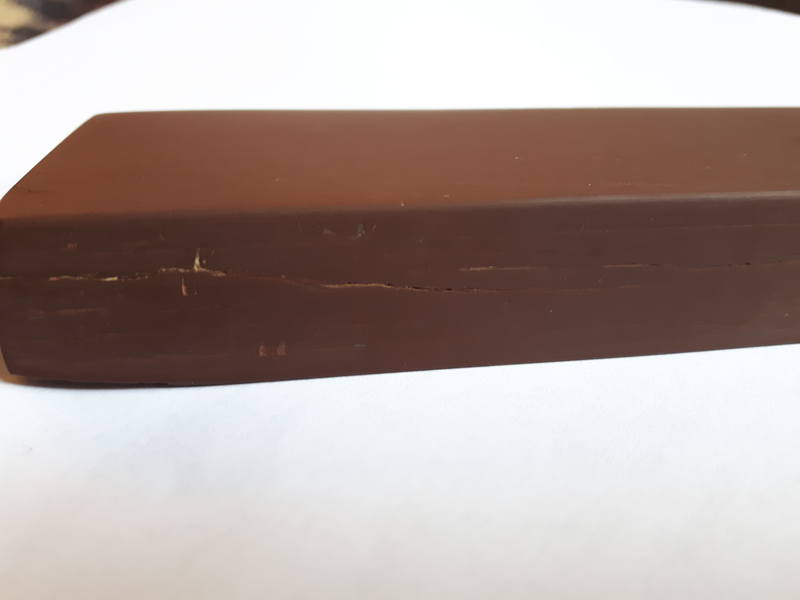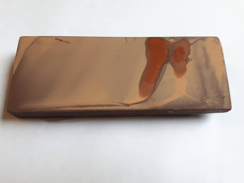 Re: Помогите определить каменьДобрый день! Может кто-то знает про вот такой камень- куплен в Монреале, при покупке был красный, но после грубой притирки стал то-ли коричневый, то-ли коричнево-красно-фиолетовый, размеры-128*48*19 , довольно твердый, суспензия красно-рыжая пахнет при притирке землей, был вставлен в такую вот штуку ну и сам камень