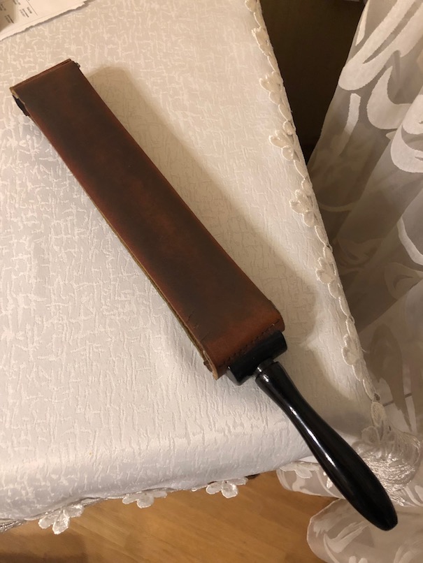 По фото понятно, что правил он неправильно, такими широкими взмахами шлёпал бритвой по середине ремня,