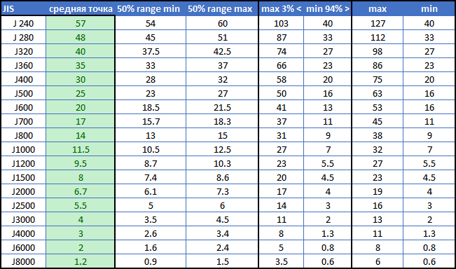 Re: Заточка на камняхВроде бы 1 дюйм "The grit sizes are defined by the number of lines per inch (25.4 mm) length of each sieve e.g. 150 lines per inch. Abrasives grit 150 will pass this sieve." https://www.fine-tools.com/G10019.html" onclick="window.open(this.href);return false; https://www.zat24.com/2010/08/grit.html" onclick="window.open(this.href);return false; Итог по табличке: 1 К = 10мкм. 10 К = 1мкм. Как новичок, не смог понять, в чем я опять не прав. Обещали не в 10 раз, но оно в 10 раз. Y=10000мкм. (1см.) X=1000 (grit). L=100000 Ничего не понял - поясните, пожалуйста. Re: Заточка на камняхPunch, это не удивительно. Главное суть уловил, просеяно через сито. Этого достаточно. Лучше озадачься вопросом почему Sandr возмутился. На примере Японского индустриального стандарта . В нем кстати 10000 нет.