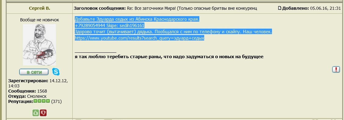 ничего не попутал? Кто просил внести в список и сказал - "Здорово точит (вытачивает) дядька. Пообщался с ним по телефону и скайпу" - ты ж не пробовал, а похвалил и ещё рекомендовал - http://britva.ru/forum/viewtopic.php?p= ... 55#p156011" onclick="window.open(this.href);return false; [attachment=1]эдуард седых 1.JPG[/attachment][attachment=0]эдуард седых 3.JPG[/attachment] наши люди открытых продаж и обсуждений не чураются и репутацию не камнями дорогими зарабатывают, а отзывами клиентов
